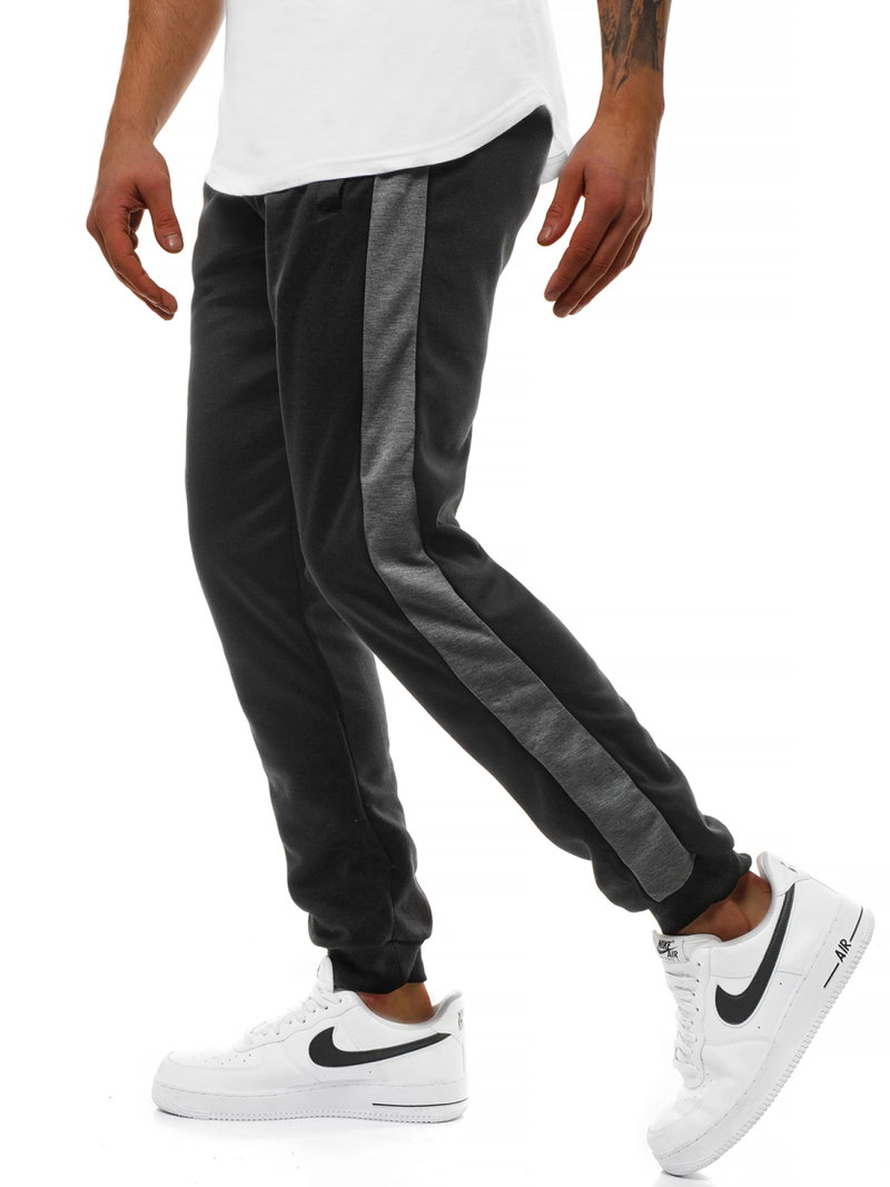 Spodnie mają fason typu joggery. Ich pas oraz nogawki zostały wykończone ściągaczami, co dodaje im sportowego charakteru. Spodnie mają praktyczne kieszenie po bokach, do których schować można telefon czy klucze. Dzięki obecności kontrastowych lampasów biegnących wzdłuż nogawek, prezentują się one bardzo efektownie. Joggery wykonane zostały z bawełny oraz poliestru, dzięki czemu ładnie układają się na ciele, są wygodne w noszeniu, przyjemne w dotyku oraz przewiewne.