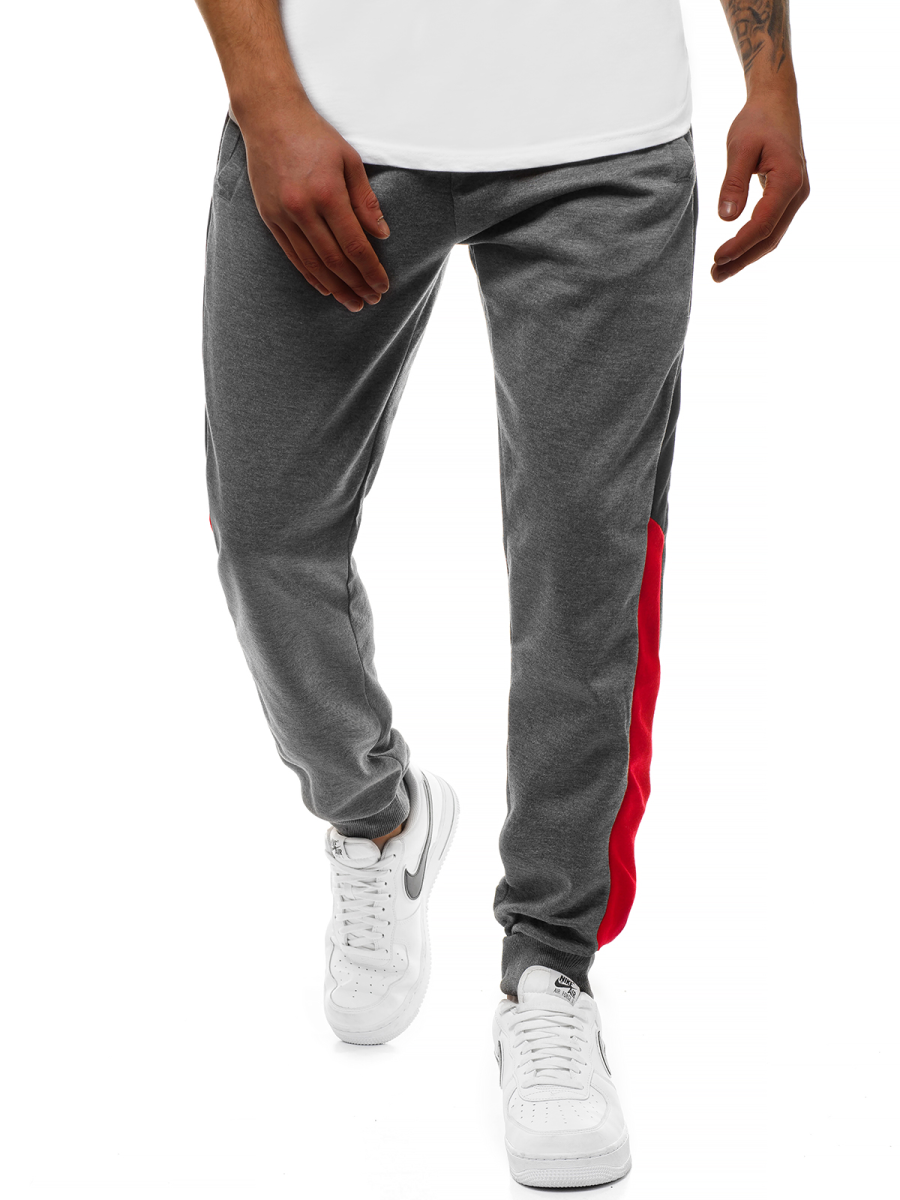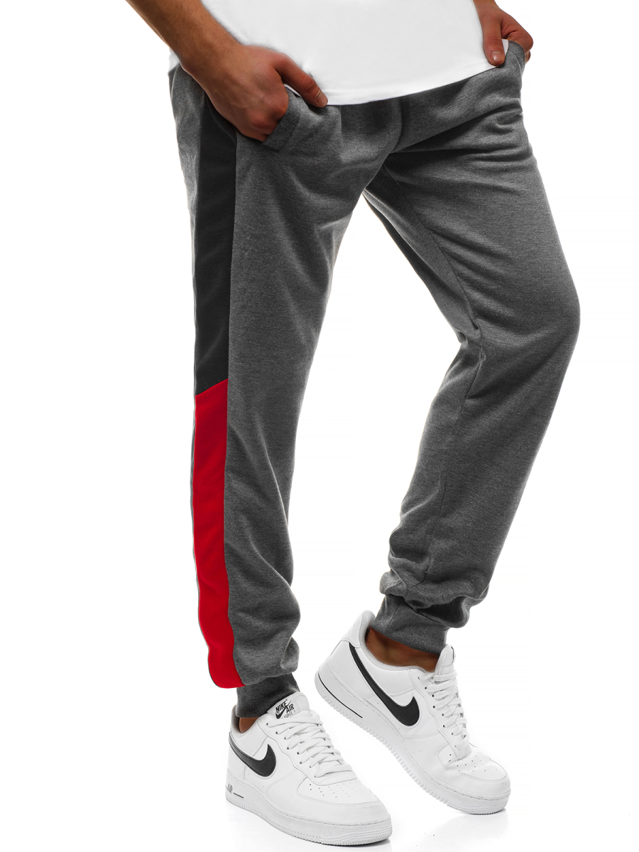 Spodnie mają fason typu joggery. Ich krój jest luźny, a pas i nogawki — wykończone ściągaczami, które nadają im sportowego charakteru. Spodnie posiadają kieszenie po bokach, do których schować można telefon czy portfel. Dzięki obecności kontrastowych lampasów wzdłuż nogawek, wyglądają one bardzo oryginalnie. Spodnie zostały wykonane z bawełny oraz poliestru. Sprawia to, że ładnie się układają, są miłe w dotyku, wygodne w noszeniu oraz przewiewne.