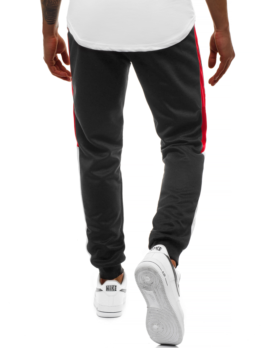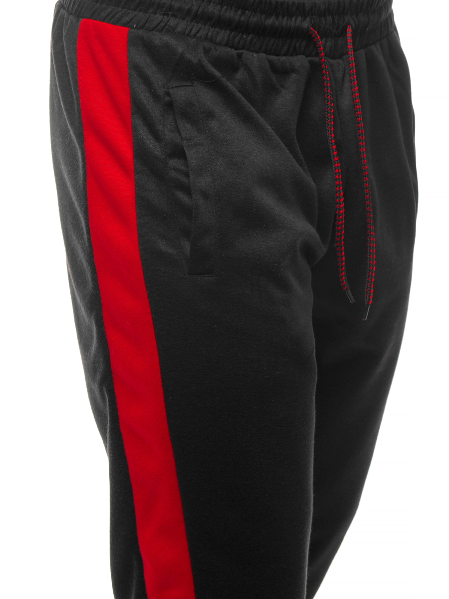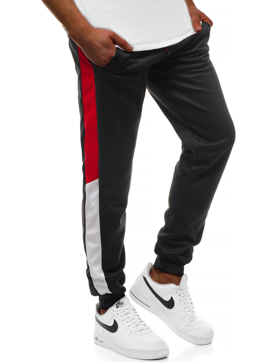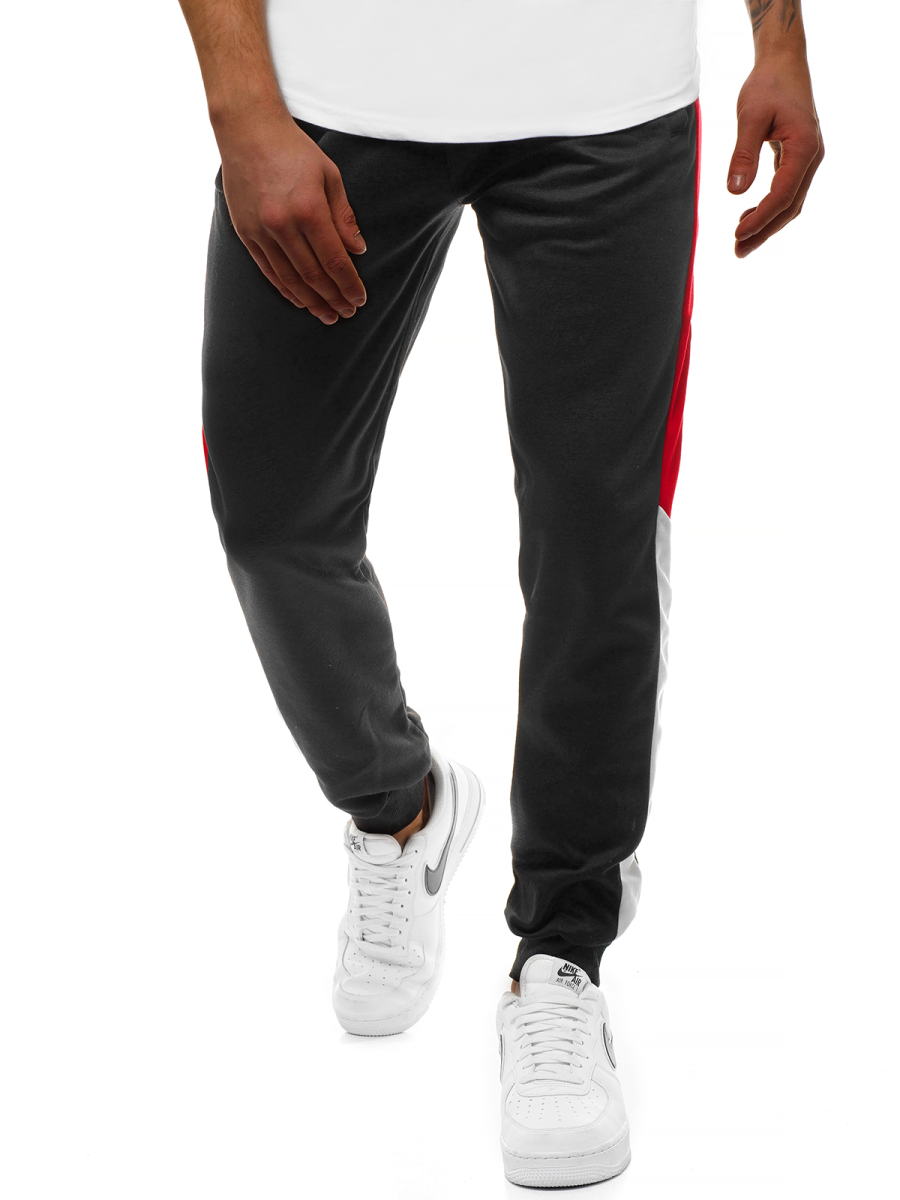 Spodnie mają fason typu joggery. Ich krój jest luźny, a pas i nogawki — wykończone ściągaczami, które nadają im sportowego charakteru. Spodnie posiadają kieszenie po bokach, do których schować można telefon czy portfel. Dzięki obecności kontrastowych lampasów wzdłuż nogawek, wyglądają one bardzo oryginalnie. Spodnie zostały wykonane z bawełny oraz poliestru. Sprawia to, że ładnie się układają, są miłe w dotyku, wygodne w noszeniu oraz przewiewne.