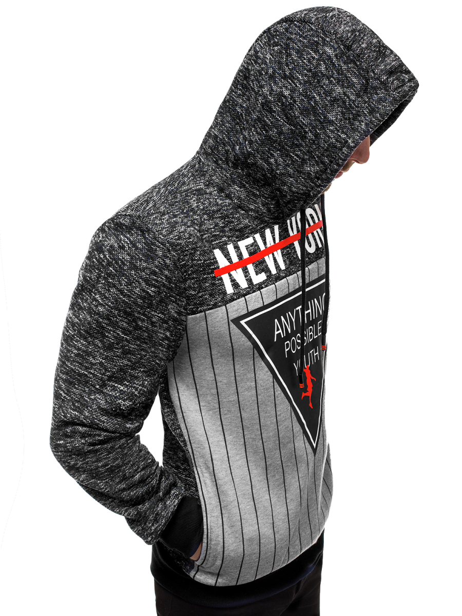 Bluza ma fason wkładany przez głowę i kaptur, który doskonale sprawdzać będzie się w deszczowe, wietrzne czy chłodne dni. Jej dół i rękawy wykończone są ściągaczami, które nadają jej sportowego charakteru. Bluza prezentuje się bardzo efektownie, czego zasługą są kontrastowe łączenia materiału oraz znajdujące się na przodzie nadruki. Została ona wykonana w całości z poliestru.