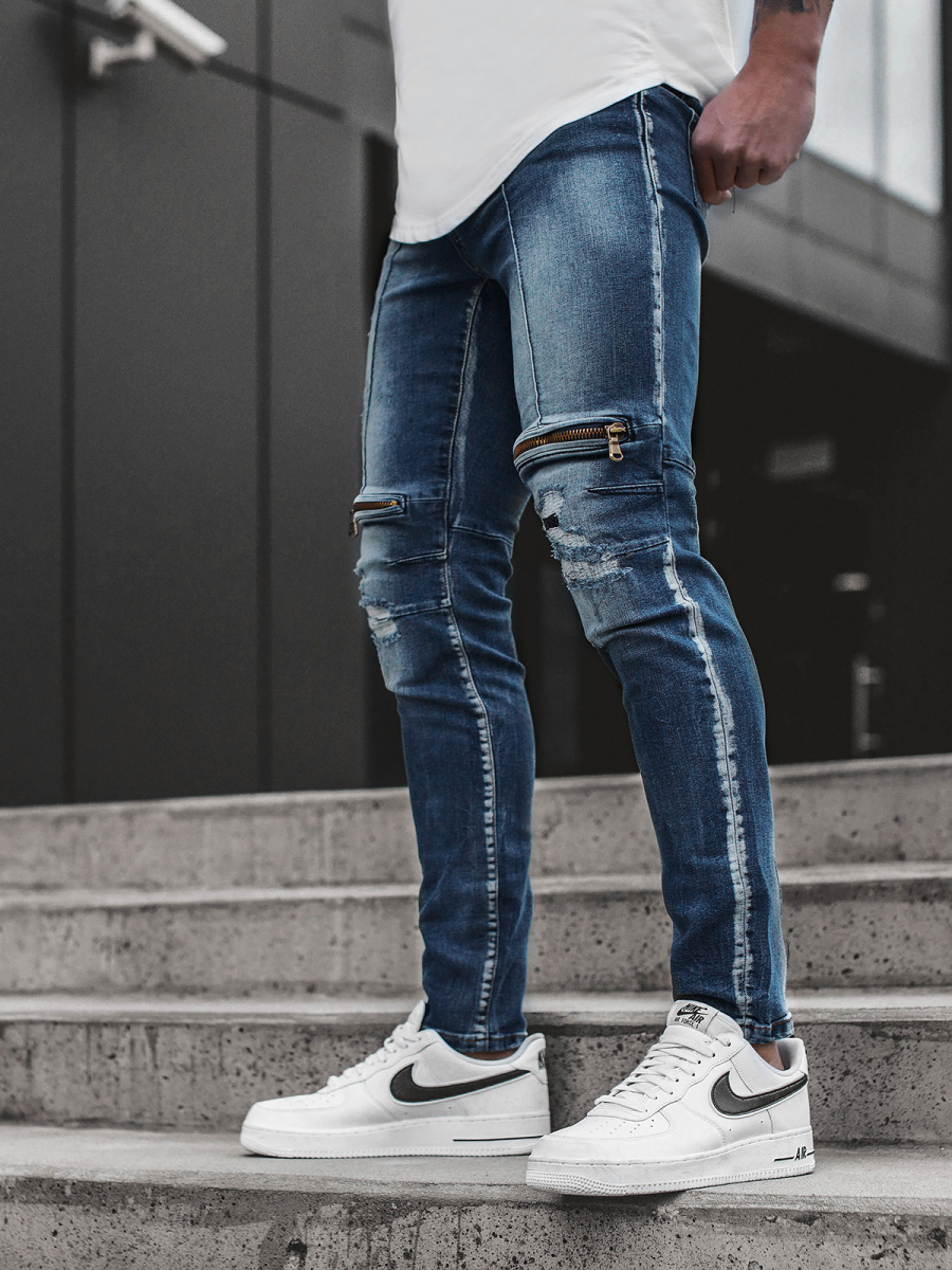 Spodnie mają kieszenie z przodu i z tyłu. Oryginalnego wyglądu nadają im znajdujące się na nogawkach ozdobne przetarcia oraz zamki i dekatyzowany wzór. Jeansy zostały wykonane z bawełny z niewielką domieszką elastanu, dzięki czemu ładnie układają się na sylwetce, są przewiewne, miłe w dotyku oraz wygodne w noszeniu.