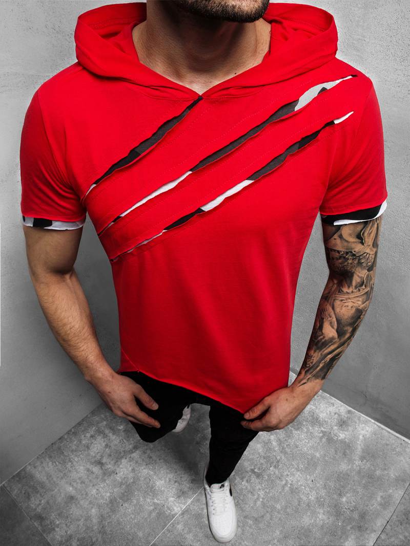 Koszulka prezentuje się niezwykle efektownie, a to dzięki dłuższemu asymetrycznemu fasonowi, kapturowi oraz oryginalnemu rozdarciu, spod którego wystaje wzór moro, idealnie wpisujący się w bardzo modny w ostatnim czasie styl militarny.