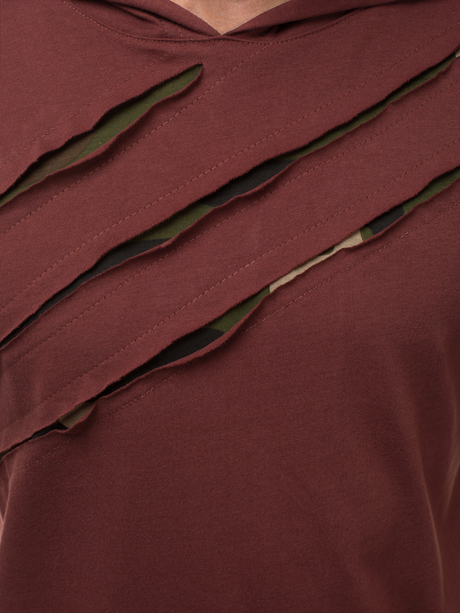 Koszulka prezentuje się niezwykle efektownie, a to dzięki dłuższemu asymetrycznemu fasonowi, kapturowi oraz oryginalnemu rozdarciu, spod którego wystaje wzór moro, idealnie wpisujący się w bardzo modny w ostatnim czasie styl militarny.