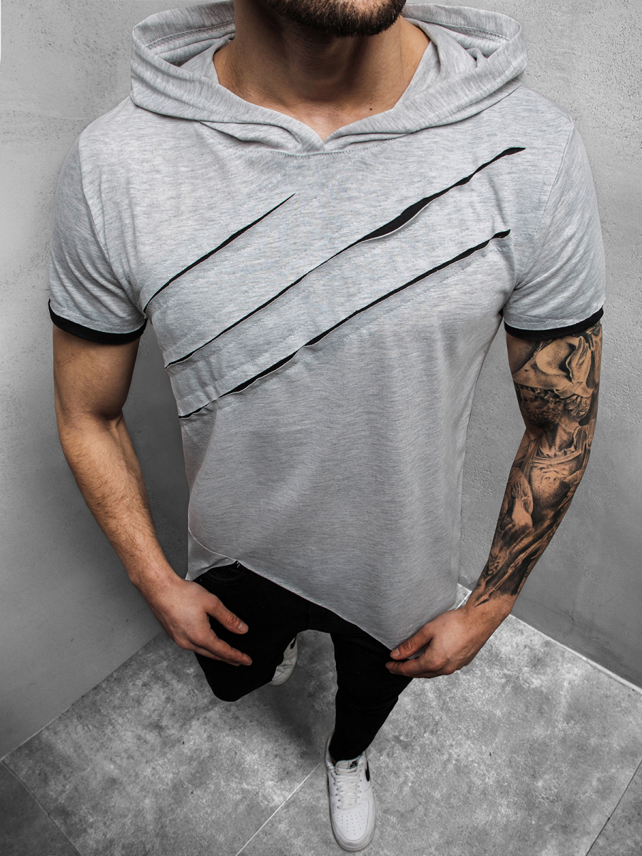 Koszulka prezentuje się niezwykle efektownie, a to dzięki dłuższemu asymetrycznemu fasonowi, kapturowi oraz oryginalnemu rozdarciu, spod którego wystaje wzór moro, idealnie wpisujący się w bardzo modny w ostatnim czasie styl militarny.