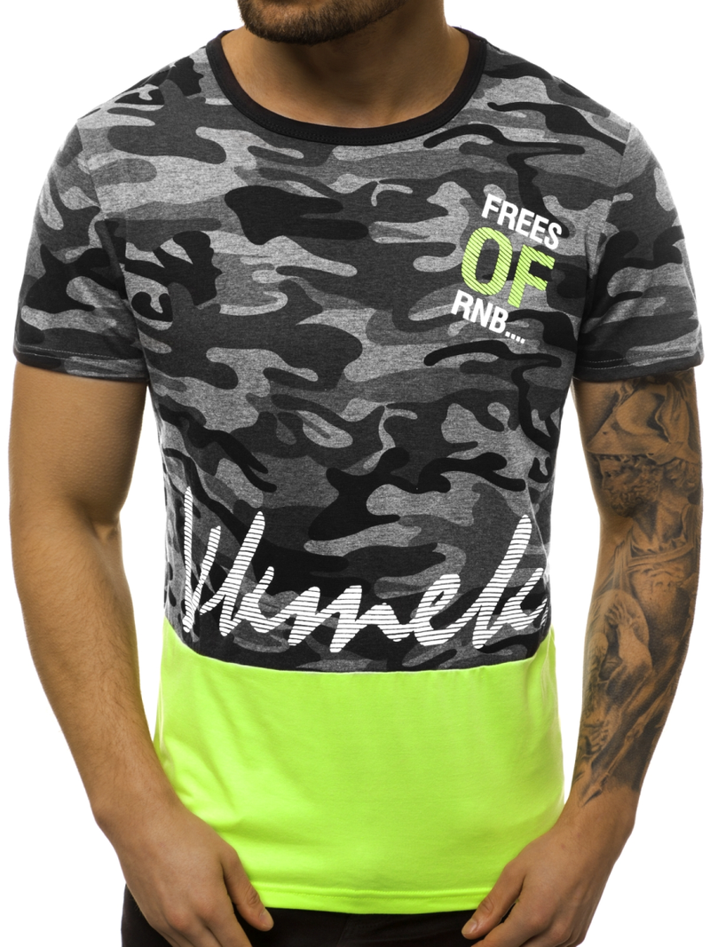 Koszulka posiada naddruk na przodzie oraz wzór camo. Oryginalnego charakteru nadaje jej kontrastowe łączenie tkaniny na dole. T-shirt ma dłuższy fason, dzięki czemu dobrze sprawdzać będzie się u wysokich mężczyzn. Posiada ona klasyczny, okrągły dekolt typu U-neck. Koszulka została wykonana z połączenia bawełny oraz poliestru, dzięki czemu ładnie układa się na sylwetce, jest wygodna w noszeniu, przyjemna w dotyku, przewiewna i odporna na uszkodzenia oraz zagniecenia.