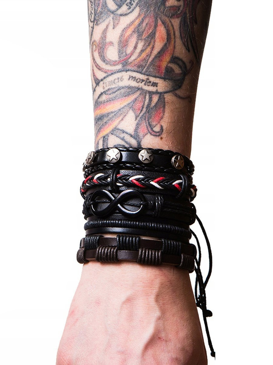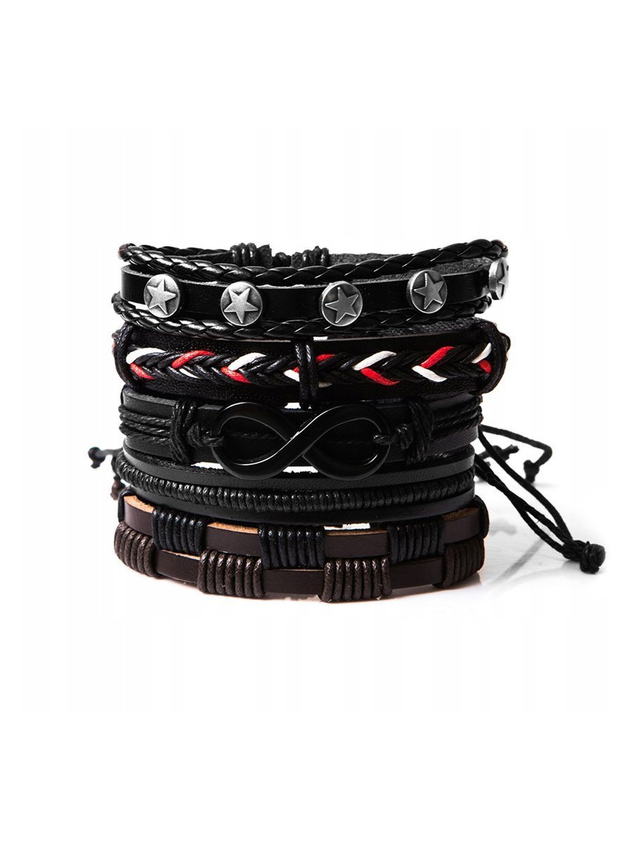 Zestaw tworzą gustowne bransoletki wykonane z wysokiej jakości, trwałej, estetycznej skóry ekologicznej o plecionym wzorze. Oryginalnego wyglądu nadają mu kontrastowe, metalowe wstawki. Obwód bransoletek jest regulowany sznurkami w zakresie od 12 do 21 centymetrów.