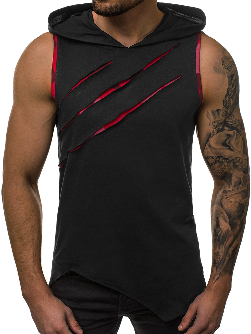 Koszulka jest pozbawiona rękawów. Posiada kaptur, dzięki czemu dobrze sprawdzać będzie się w chłodniejsze czy wietrzne dni. Oryginalnego charakteru nadaje jej dłuższy, asymetryczny fason i przetarcia na przodzie z kontrastowymi wstawkami. T-shirt został wyprodukowany w całości z bawełny, dzięki czemu jest on wygodny w noszeniu, miły w dotyku, przewiewny i odporny na uszkodzenia oraz zagniecenia.