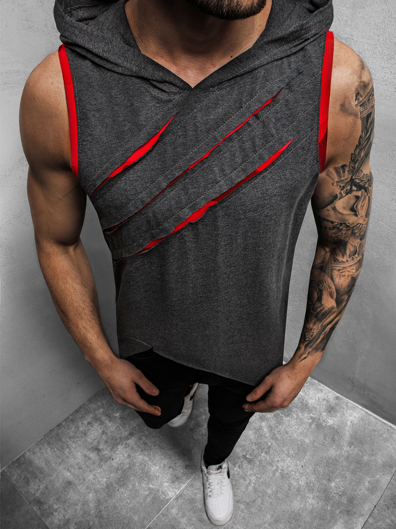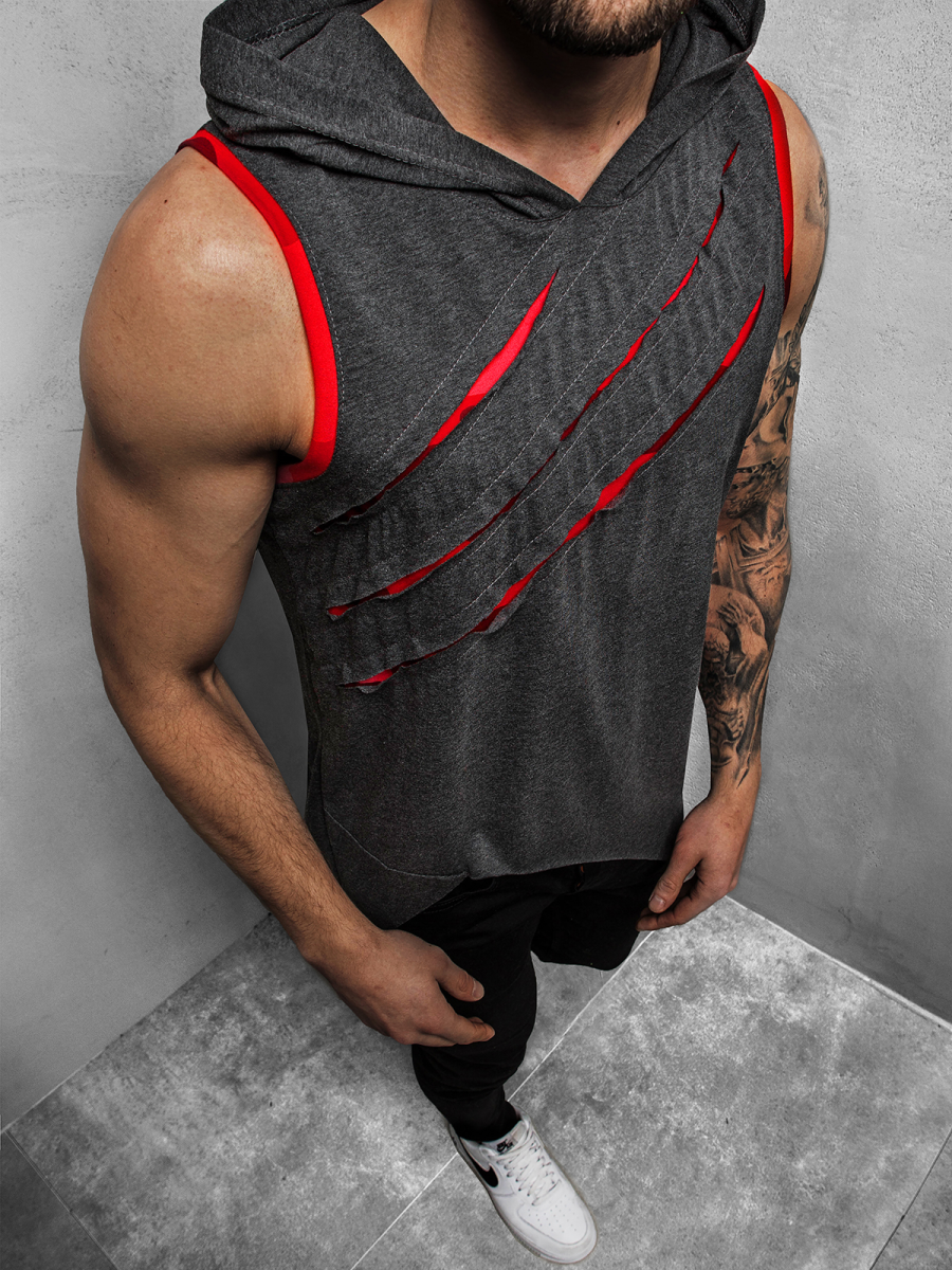 Koszulka jest pozbawiona rękawów. Posiada kaptur, dzięki czemu dobrze sprawdzać będzie się w chłodniejsze czy wietrzne dni. Oryginalnego charakteru nadaje jej dłuższy, asymetryczny fason i przetarcia na przodzie z kontrastowymi wstawkami. T-shirt został wyprodukowany w całości z bawełny, dzięki czemu jest on wygodny w noszeniu, miły w dotyku, przewiewny i odporny na uszkodzenia oraz zagniecenia.