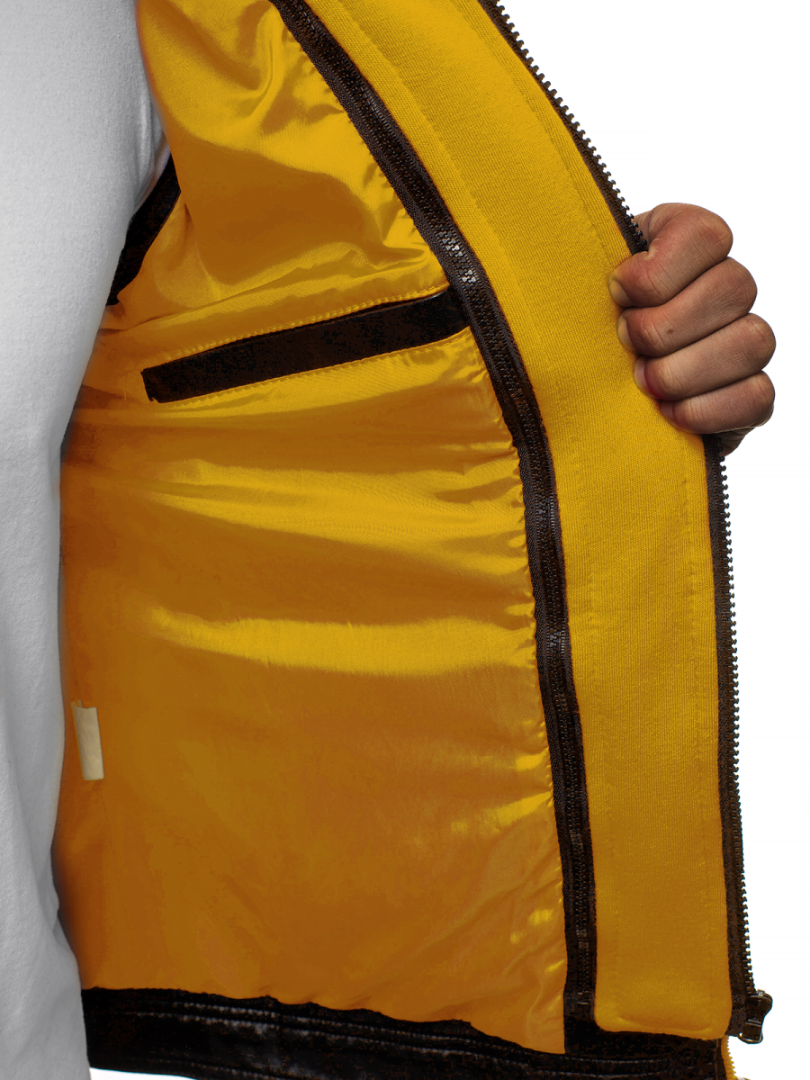 Kurtka posiada odpinaną wstawkę wewnątrz imitującą bluzę z kapturem. Element ten doskonale sprawdzać będzie się w chłodne, wietrzne, deszczowe dni, nadając całości oryginalnego wyglądu. Kurtka ma praktyczne kieszenie po bokach i w środku, do których schować można telefon, klucze czy portfel. Wykonana została ona z połączenia poliuretanu oraz poliestru, a jej podszewka z poliestru.