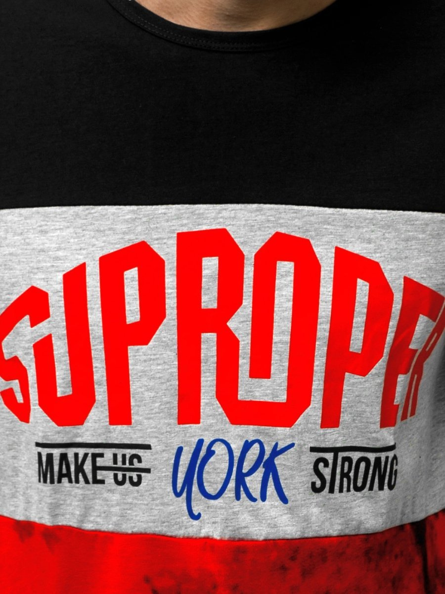 T-shirt ma nadruk na przodzie oraz kontrastowe łączenie tkaniny na przodzie i rękawach, dzięki czemu prezentuje się bardzo efektownie. Posiada on klasyczny, okrągły dekolt typu U-neck. Koszulka została wyprodukowana z połączenia bawełny oraz poliestru, co sprawia, że ładnie dopasowuje się do sylwetki, jest wygodna w noszeniu, przyjemna w dotyku oraz nie wymaga prasowania.