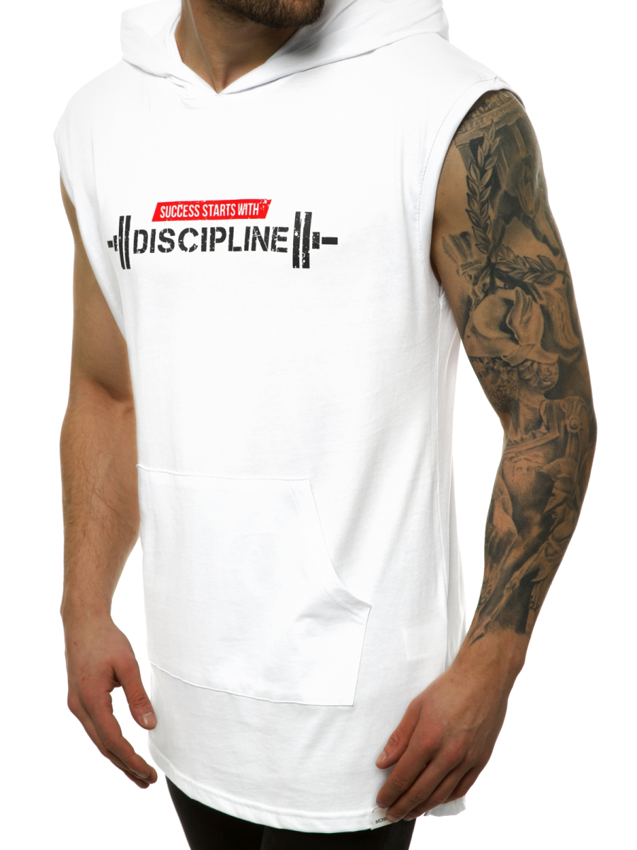 Tanktop to rodzaj koszulki bez rękawów. Model ten posiada praktyczny kaptur, który świetnie sprawdzać będzie się w nieco chłodniejsze, wietrzne dni. Na przodzie koszulki znajduje się kieszeń typu kangurka oraz nadruk. Tanktop został wyprodukowany w całości z wysokiej jakości bawełny. Sprawia to, że jest bardzo wygodny w noszeniu, przyjemny w dotyku, miękki, przewiewny i nie gniecie się.