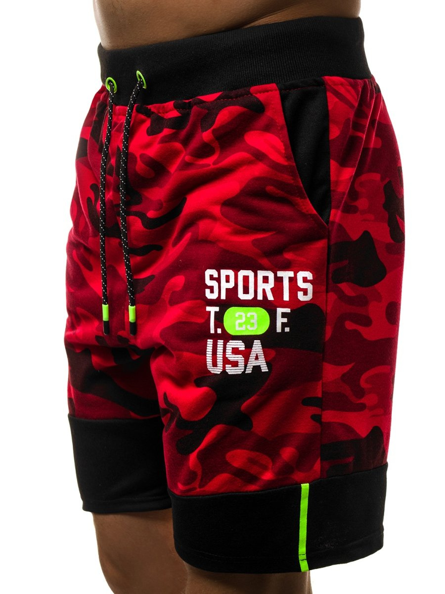 Spodenki mają w pasie praktyczny ściągacz, dzięki czemu dobrze trzymają się ciała i nie przesuwają w czasie noszenia. Po bokach znajdują się pojemne kieszenie, do których schować można klucze, portfel czy telefon. Oryginalnego charakteru nadaje im wzór camo, kontrastowe wstawki oraz znajdujący się na nogawce wzór. Spodenki zostały wykonane z połączenia bawełny oraz poliestru, co sprawia, że bardzo ładnie układają się na sylwetce, są wygodne, miękkie, miłe w dotyku i nie gniotą się.
