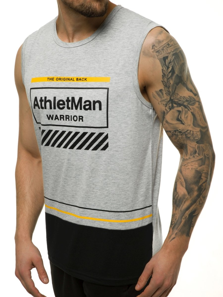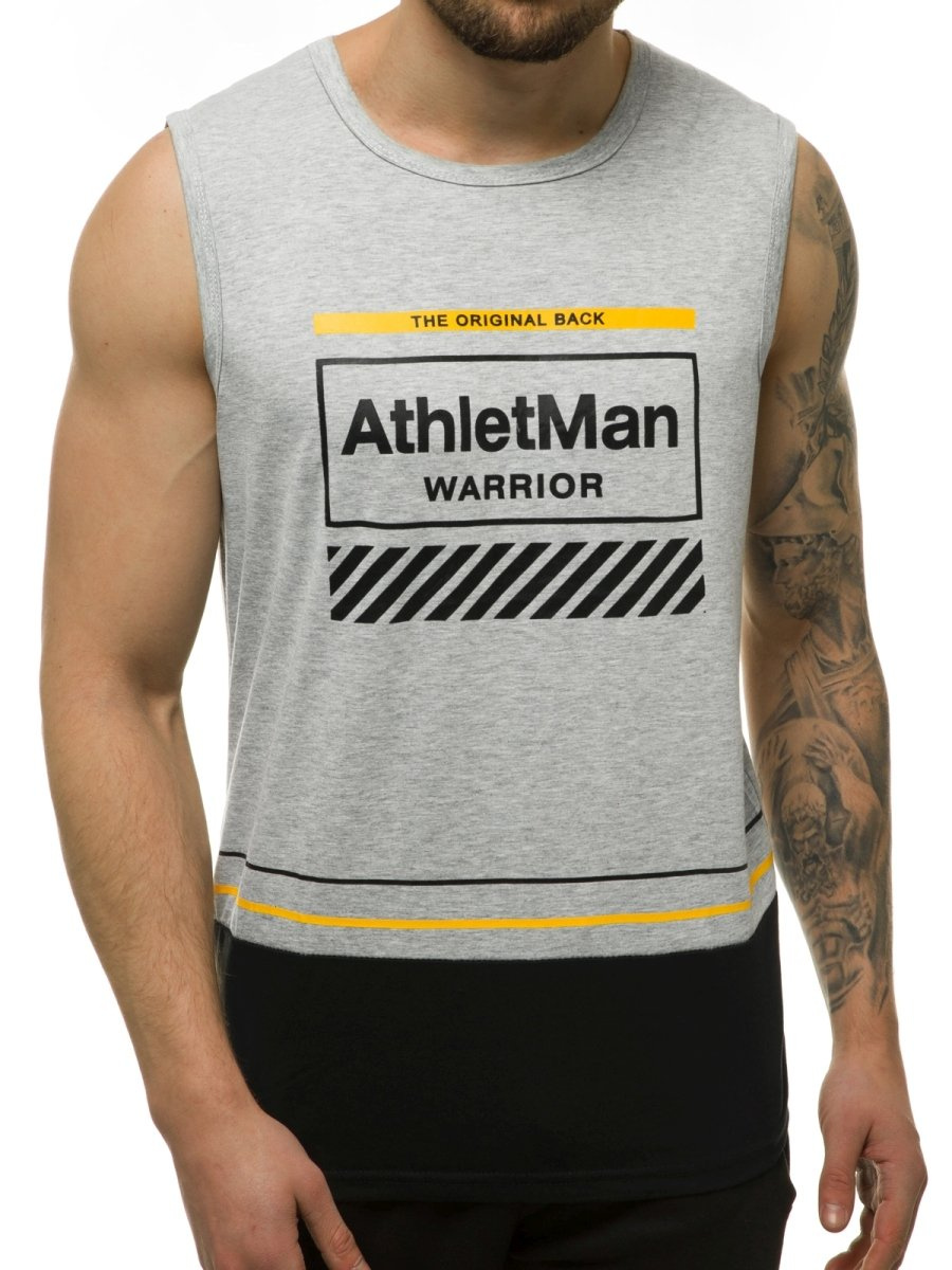 Tego typu koszulka bez rękawów określana jest mianem tanktopu. Model ten posiada nadruk na przodzie oraz kontrastowe łączenie tkaniny na dole, dzięki czemu wygląda bardzo efektownie. Tanktop został wyprodukowany z połączenia bawełny oraz poliestru. Sprawia to, że ładnie dopasowuje się do sylwetki, jest wygodny w noszeniu, miły w dotyku, nie gniecie się i nie rozciąga.