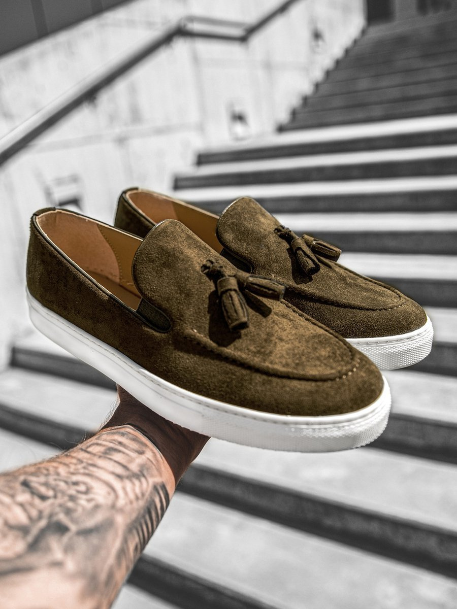 Tego typu wsuwane trampki określa się mianem slip — on. Model ten posiada okrągły nosek i ozdobne chwosty, które nadają butom oryginalnego wyglądu. Jego zewnętrzna część wykonana została z wysokiej jakości materiału syntetycznego, wnętrze — z tkaniny tekstylnej, a podeszwa — z tworzywa sztucznego.