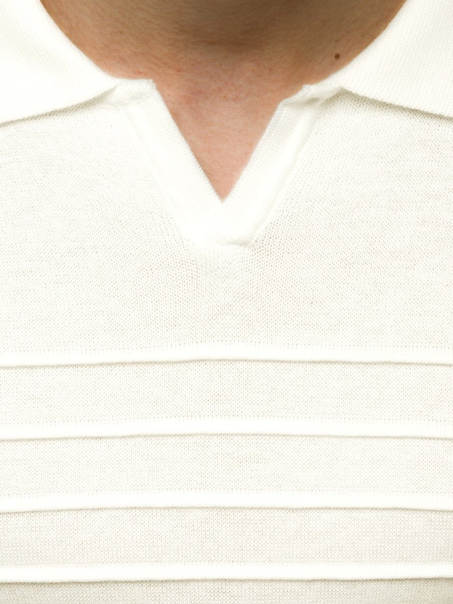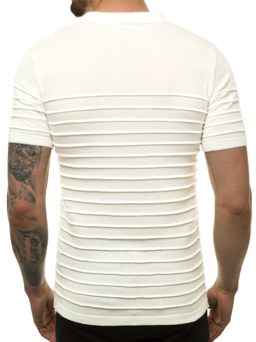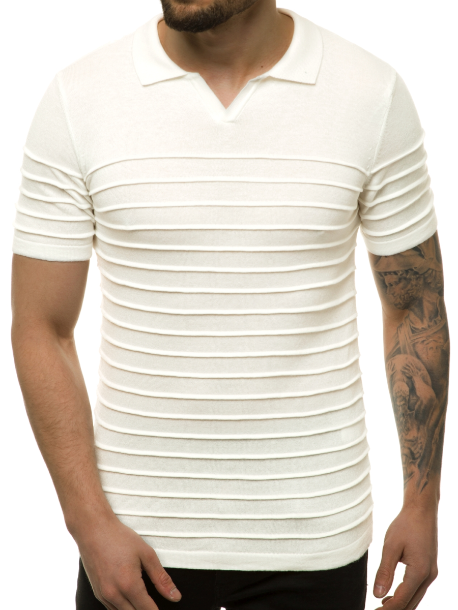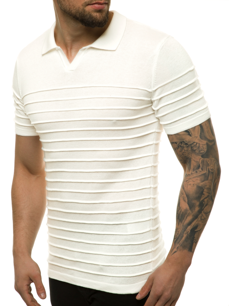 Koszulka ma krótki rękaw i klasyczny kołnierzyk typu kent. Pokrywa ją efektowny, prążkowany wzór. Polówka została wykonana z połączenia bawełny, akrylu oraz wiskozy, dzięki czemu ładnie dopasowuje się do sylwetki, nie rozciąga i nie gniecie, jest wygodna w noszeniu i miła w dotyku.