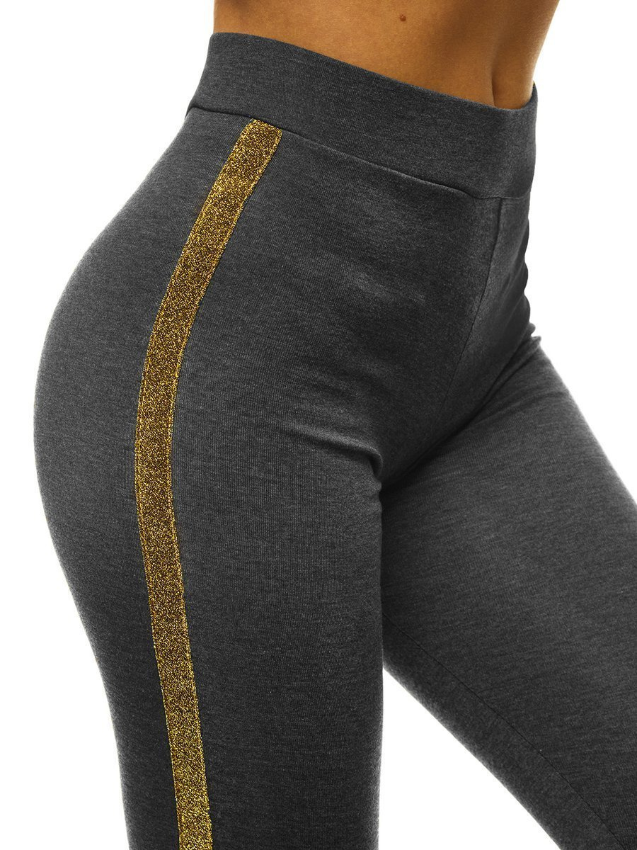 Legginsy zostały wykonane z połączenia bawełny, poliestru oraz elastanu, dzięki czemu są wygodne w noszeniu, przyjemne w dotyku, nie rozciągają się, nie gniotą i ładnie dopasowują się do sylwetki. W pasie znajduje się praktyczny ściągacz, który skutecznie chroni je przed przesuwaniem się i zsuwaniem. Oryginalnego wyglądu nadają legginsom kontrastowe lampasy znajdujące się po bokach.
