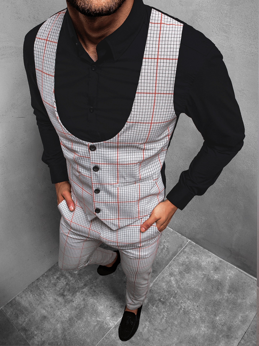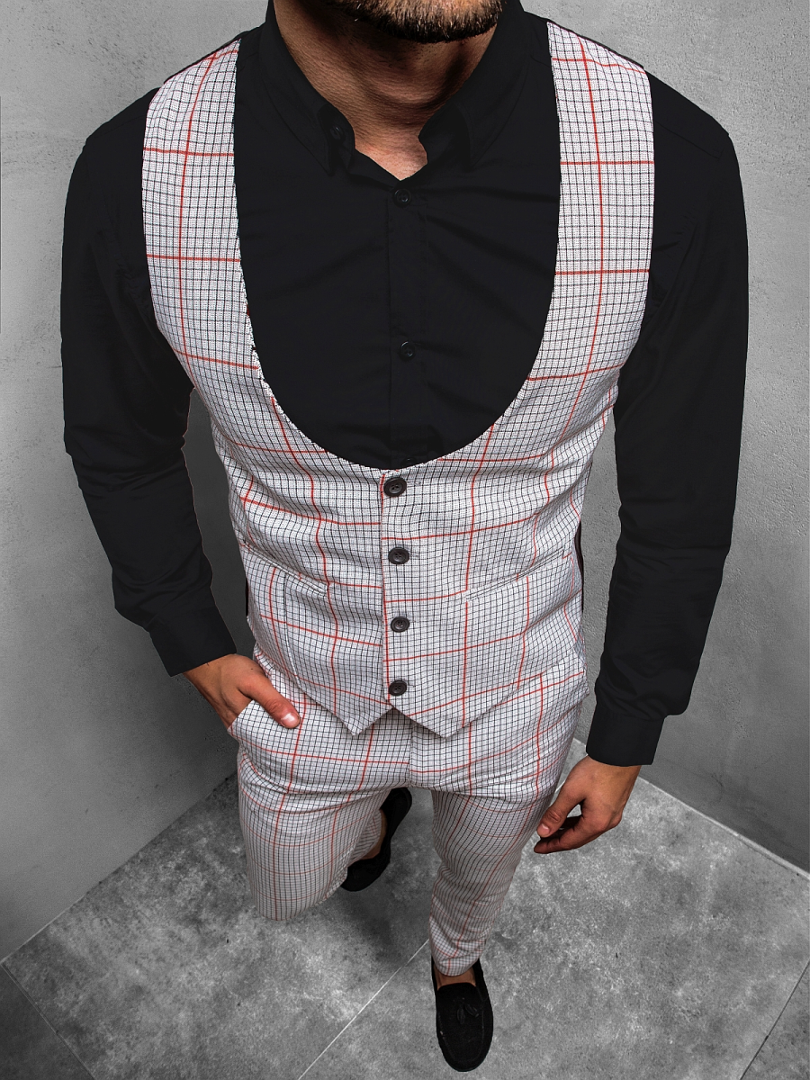 Komplet składa się z kamizelki zapinanej na guziki oraz spodni z kieszeniami z przodu i z tyłu. Pokrywa go wzór w kratę. Zestaw został wyprodukowany w całości z bawełny. Sprawia to, że jest on bardzo wygodny w noszeniu, przyjemny w dotyku, przewiewny oraz odporny na zagniecenia i uszkodzenia.