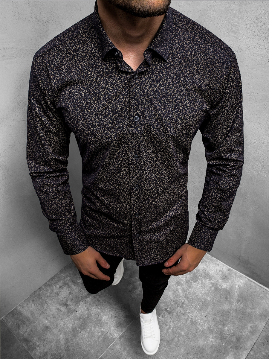 Koszulę pokrywa drobny, oryginalny, przykuwający wzrok wzór. Ma ona długi rękaw, zapięcie na guziki oraz kołnierzyk typu kent. Koszula została wykonana z wysokiej jakości bawełny z domieszką elastanu. Sprawia to, że bardzo ładnie układa się ona na ciele, jest wygodna w noszeniu, przyjemna w dotyku, nie rozciąga się z czasem i nie gniecie.