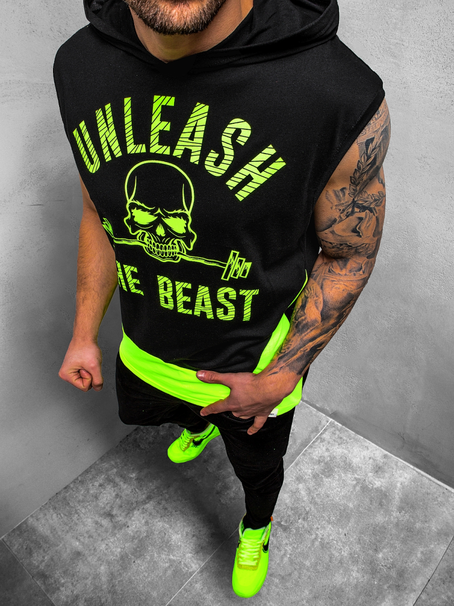 Tego typu t-shirt bez rękawów określany jest mianem tanktopu. Posiada on praktyczny kaptur, który świetnie sprawdzać będzie się w nieco chłodniejsze, wietrzne dni. Na przodzie t-shirtu znajduje się nadruk z motywem czaszki oraz kontrastowa wstawka. Tanktop został wykonany w całości z bawełny, dzięki czemu jest przyjemny w dotyku, miękki, wygodny w noszeniu oraz odporny na uszkodzenia i zagniecenia.