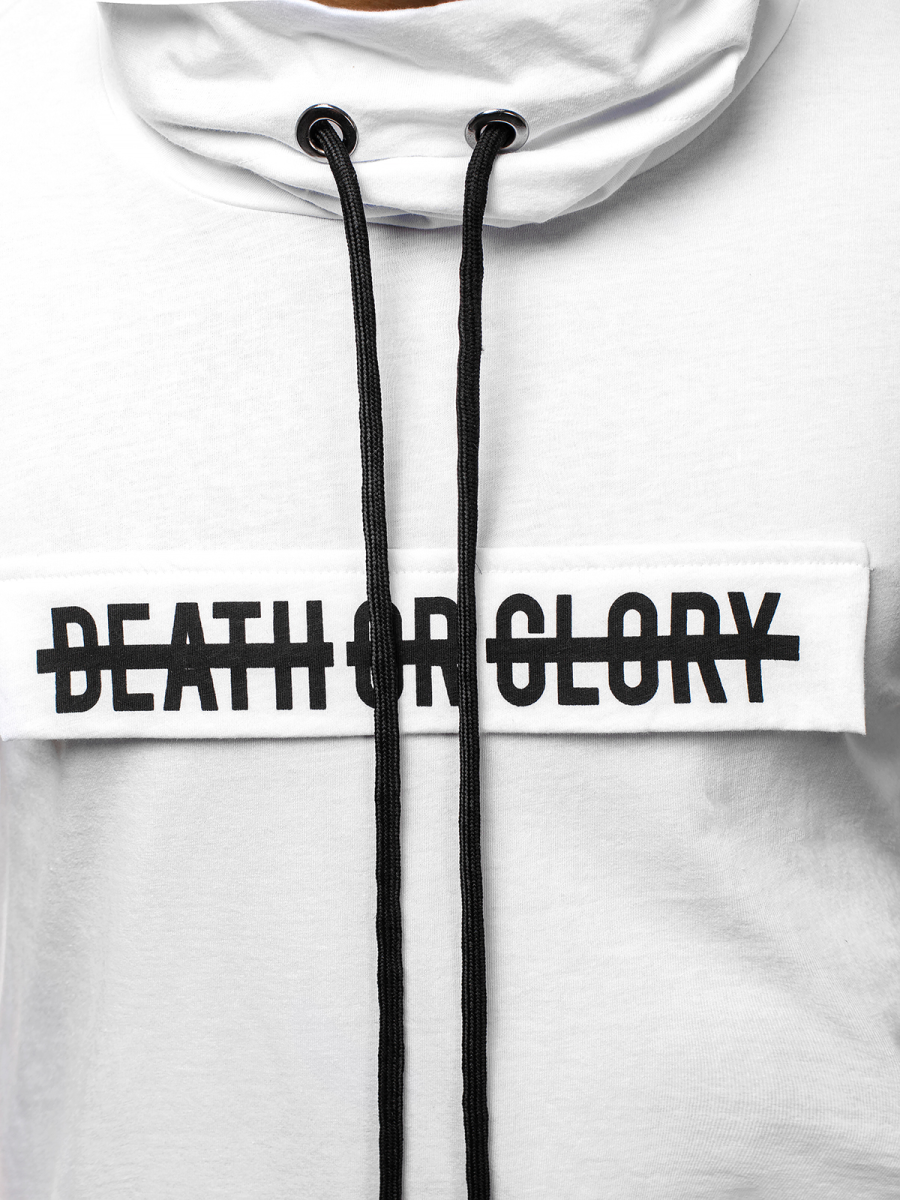 Wkładając taki t-shirt można mieć pewność, że nikt nie przejdzie obok nas obojętnie. Posiada on kołnierz pod szyję typu komin ze sznurkami, wstawkę z nadrukiem na przodzie oraz ściągacz z nadrukiem przy rękawach. Dłuższy fason za pas sprawia, że koszulkę z powodzeniem nosić mogą również wysocy mężczyźni. Wykonana została ona w całości z bawełny. Jest to tkanina wygodna w noszeniu, miła w dotyku, przewiewna i odporna na uszkodzenia oraz zagniecenia.