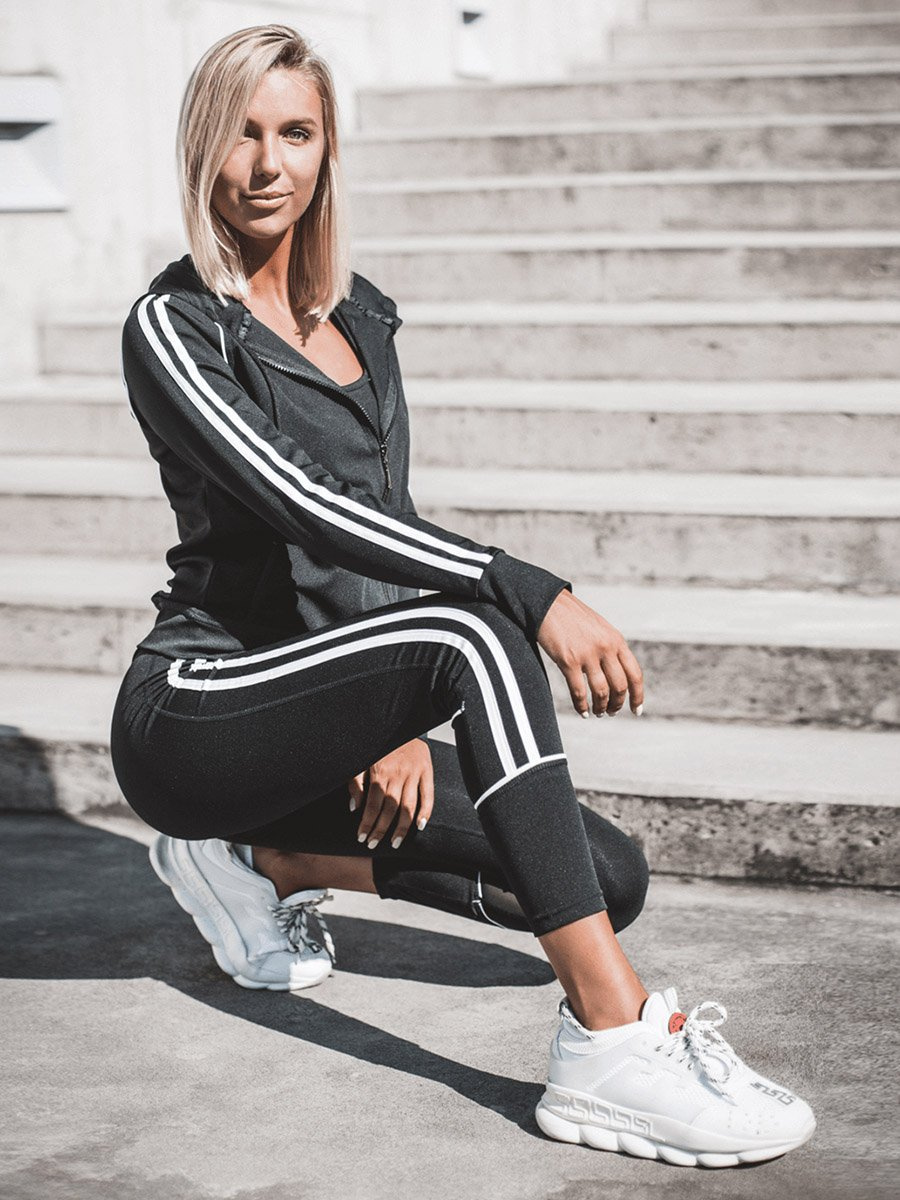 W skład kompletu wchodzą 2 elementy. Jednym z nich jest zapinana na zamek błyskawiczny bluza. Posiada ona praktyczny kaptur, który doskonale sprawdzać będzie się w chłodne, wietrzne dni. Bluza ma także kieszenie na zamek, do których schować można telefon czy klucze. Drugi z elementów zestawu to legginsy. Oryginalnego charakteru nadają całości znajdujące się na rękawach oraz nogawkach kontrastowe lampasy.