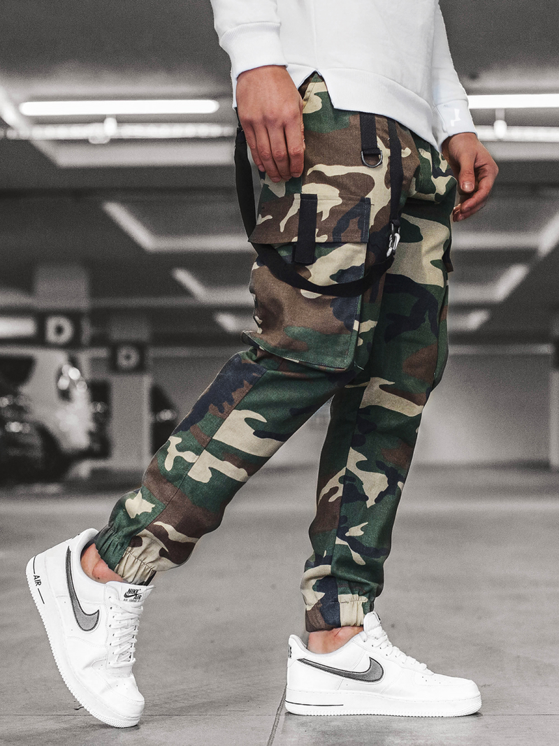 Spodnie mają fason typu joggery. Ich krój jest luźny, a pas i nogawki — wykończone ściągaczami. Joggery mają kieszenie z boku, z przodu oraz z tyłu. Oryginalnego wyglądu nadają im odpinane szelki. Spodnie wykonane zostały w całości z bawełny. Sprawia to, że są one przyjemne w dotyku, przewiewne oraz odporne na uszkodzenia i zagniecenia.