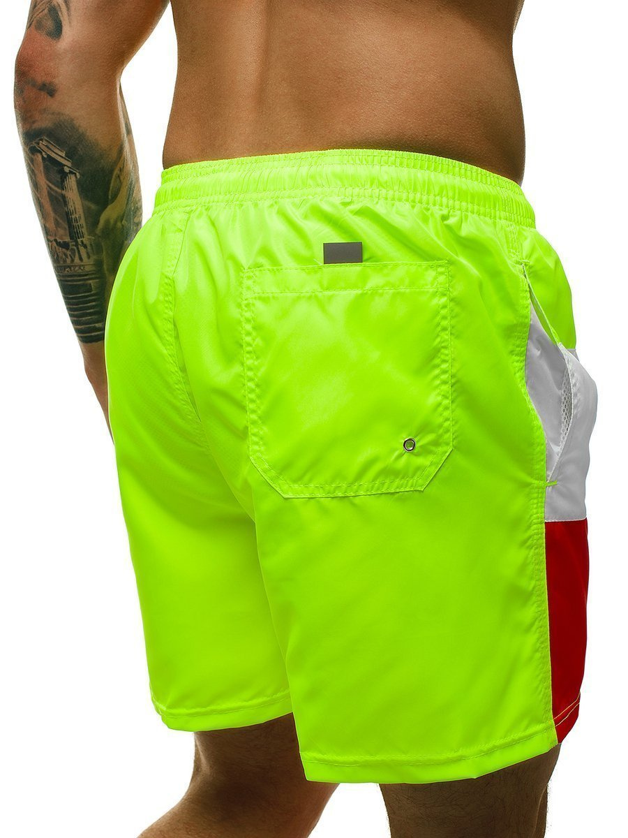 Spodenki mają w pasie praktyczny ściągacz, który ułatwia dopasowanie ich do sylwetki i skutecznie chroni przed przesuwaniem się podczas noszenia. Po bokach znajdują się 2 kieszenie, a z tyłu 1 zapinana na rzep, do których schować można klucze czy portfel. Dzięki kontrastowym łączeniom tkaniny, spodenki prezentują się bardzo efektownie. Wykonane zostały one z wysokiej jakości poliestru, który szybko schnie, nie gniecie się i nie rozciąga.