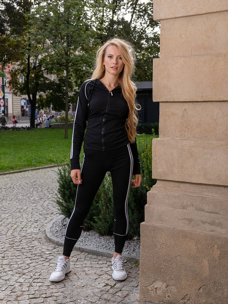 W skład kompletu wchodzą 3 elementy: koszulka bez rękawów, rozpinana bluza z kapturem oraz spodnie. Oryginalnego charakteru nadają całości kontrastowe wstawki znajdujące się na rękawach i nogawkach. Zestaw został wykonany z połączenia nylonu oraz elastanu. Sprawia to, że całość ładnie dopasowuje się do sylwetki, nie rozciąga się i nie gniecie.