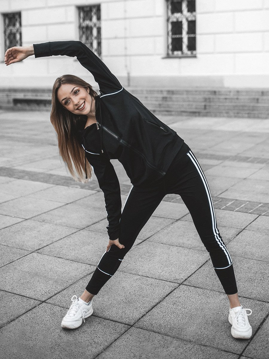Taki zestaw nadaje się na wiele różnych okazji. Założyć można go na trening na siłowni, zajęcia fitness, jogging czy rower. Komplet ma uniwersalny, ponadczasowy fason, który nigdy nie wychodzi z mody. Pasować będzie on każdej kobiecie, bez względu na wiek czy typ sylwetki. Zestaw z powodzeniem nosić można przez cały rok. Najlepiej komponować będzie się on z obuwiem sportowym.
