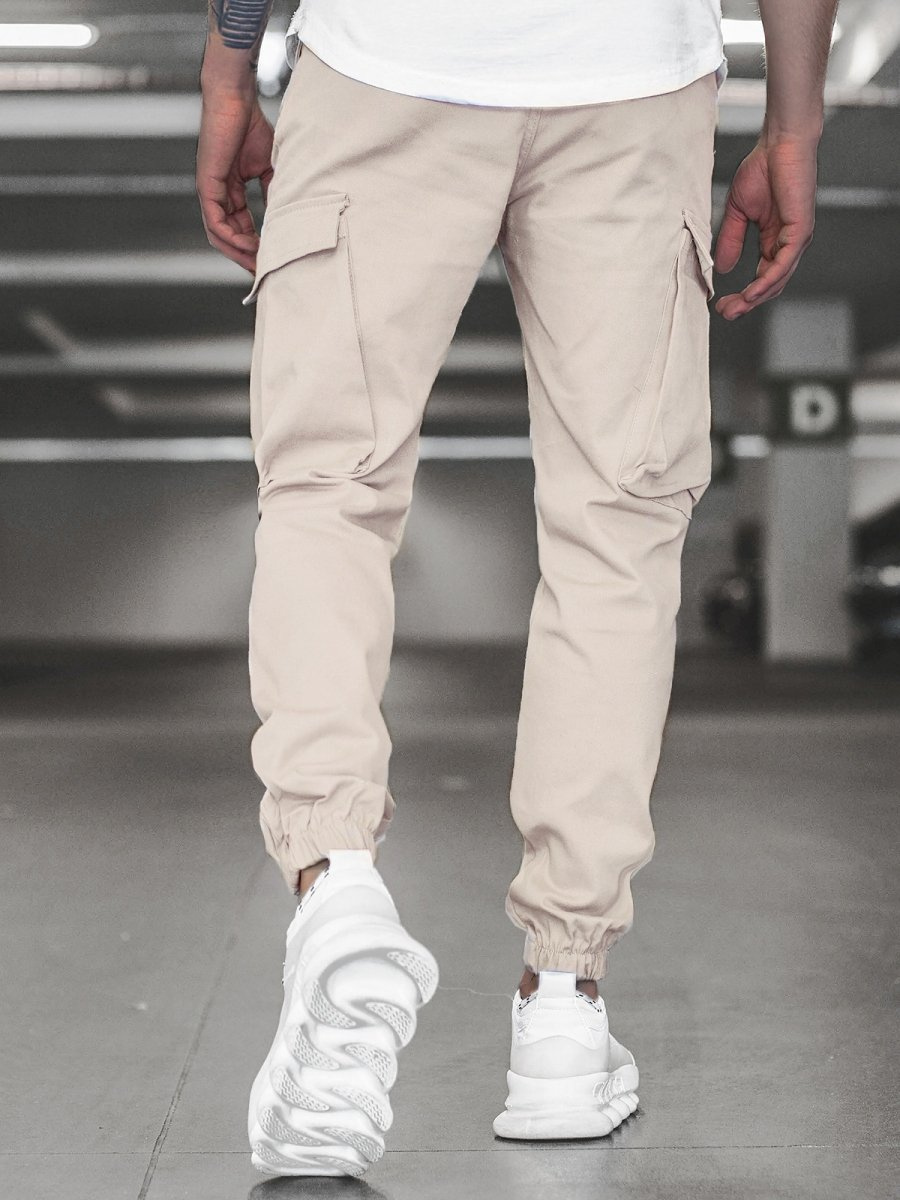 Spodnie posiadają ściągacze w pasie i przy nogawkach, które nadają im sportowego charakteru. Mają one kieszenie z przodu i po bokach, do których schować można niezbędne drobiazgi, takie jak klucze, telefon czy portfel. Spodnie zostały wykonane z bawełny z domieszką elastanu. Sprawia to, że są wygodne w noszeniu, przyjemne w dotyku, nie rozciągają się z czasem i nie gniotą.