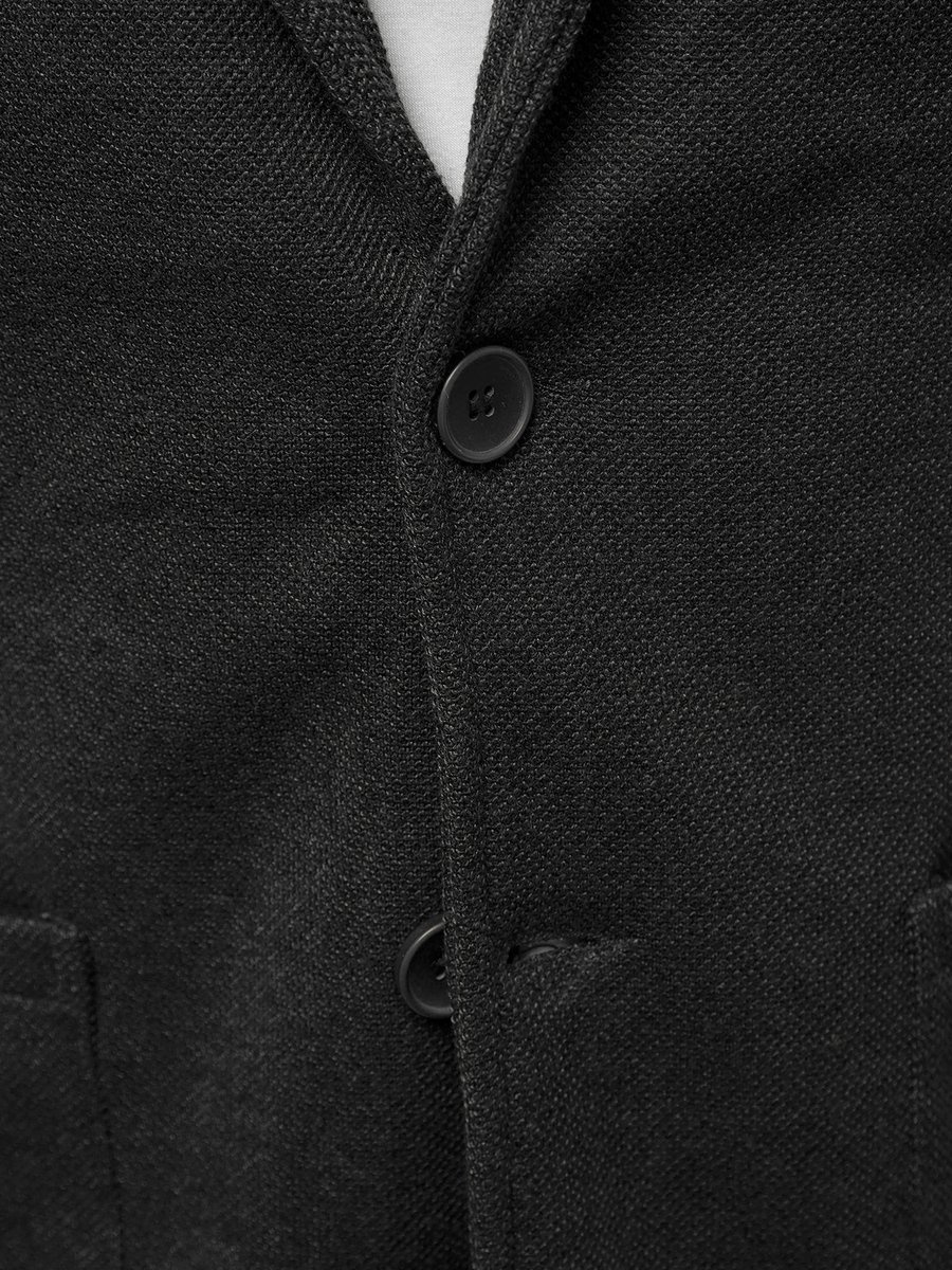 Marynarka posiada klasyczny krój. Jest zapinana na guziki. Po bokach znajdują się kieszenie. Marynarkę pokrywa designerski wzór, który nadaje jej oryginalnego charakteru. Została ona wykonana w całości w poliestru, dzięki czemu ładnie dopasowuje się do sylwetki, nie rozciąga się z czasem i nie gniecie.