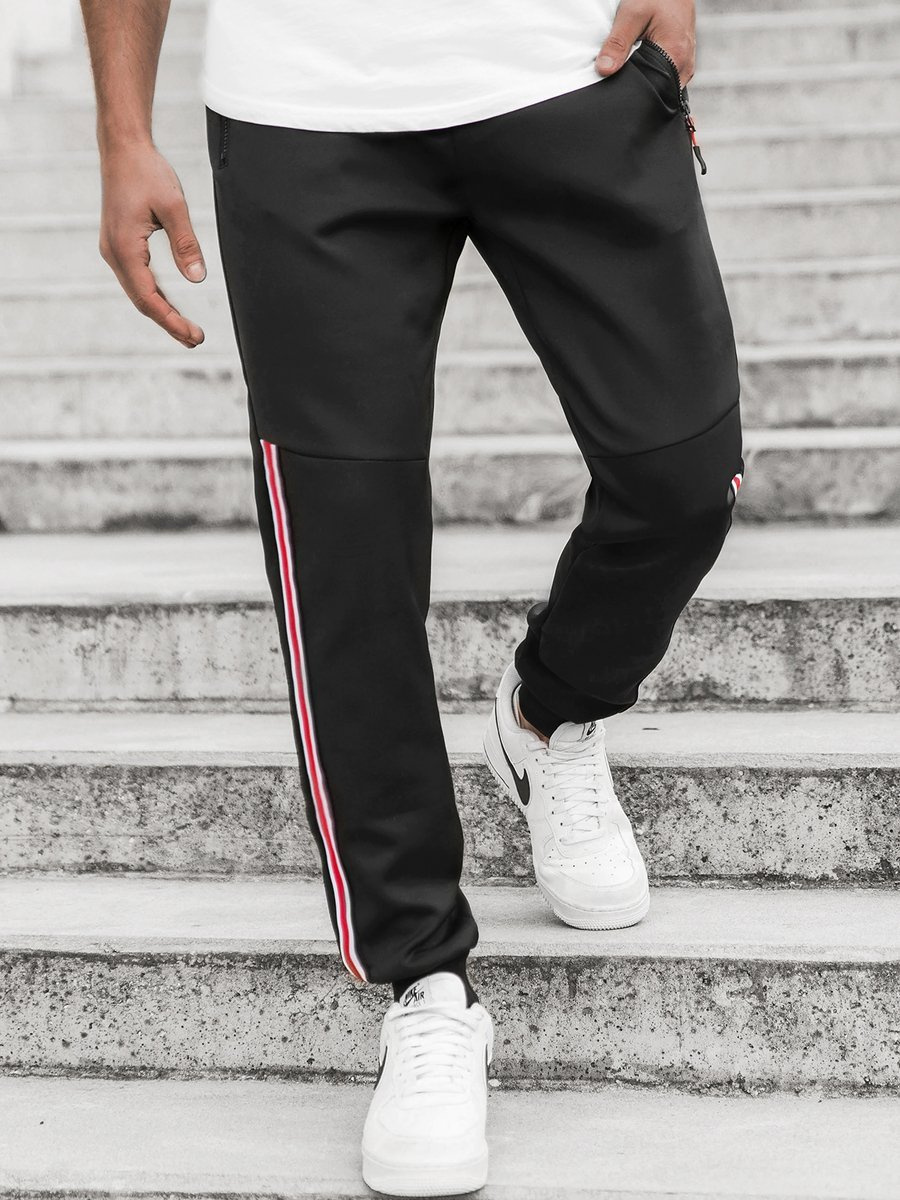 Joggery mają pas i nogawki wykończone ściągaczami, co nadaje im sportowego charakteru i gwarantuje wysoki komfort noszenia. Po bokach znajdują się praktyczne kieszenie, do których schować można niezbędne drobiazgi, takie jak klucze, portfel czy telefon. Kontrastowe lampasy sprawiają, że spodnie prezentują się bardzo oryginalnie. Zostały one wykonane z wysokiej jakości poliestru, dzięki czemu ładnie układają się na ciele, nie rozciągają się z czasem, nie gniotą i szybko schną.