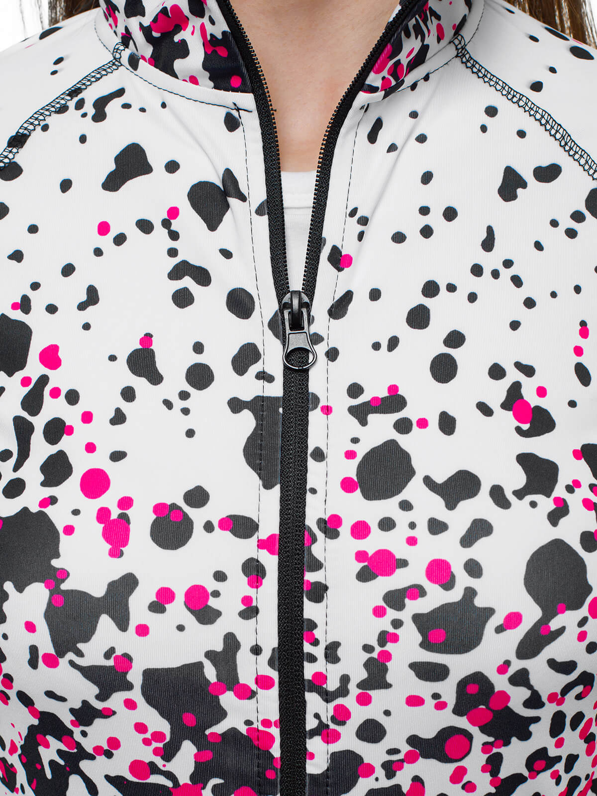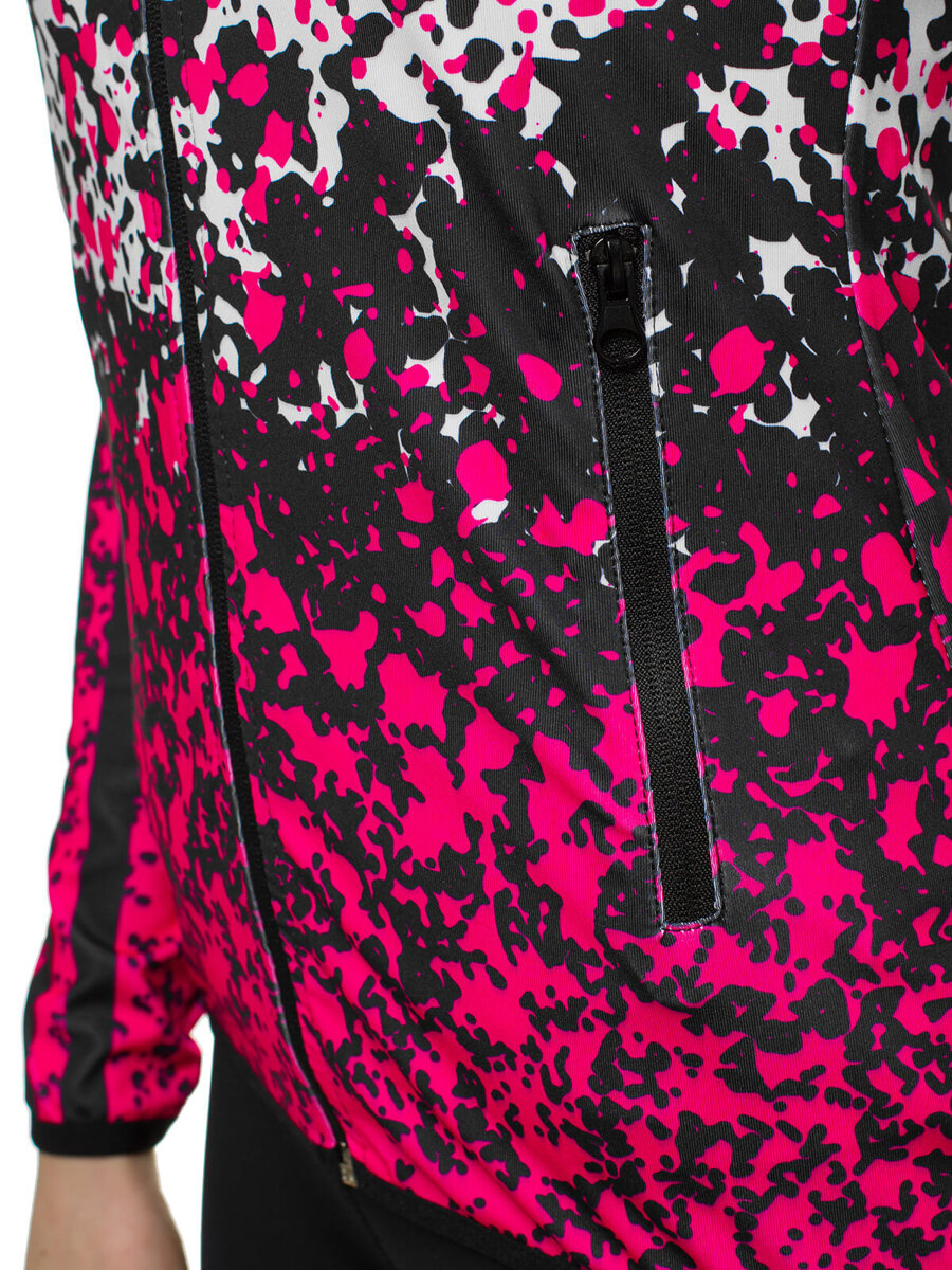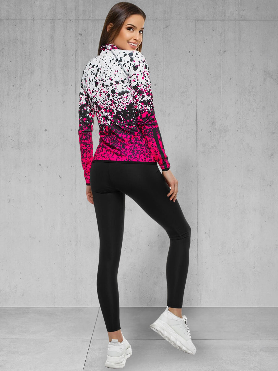 W skład kompletu wchodzą 2 elementy. Są nimi rozpinana bluza z kieszeniami po bokach oraz legginsy. Całość zdobi efektowny, kontrastowy wzór. Zestaw został wykonany z wysokiej jakości poliestru z domieszką elastanu. Sprawia to, że ładnie dopasowuje się on do sylwetki, nie rozciąga się i nie gniecie.