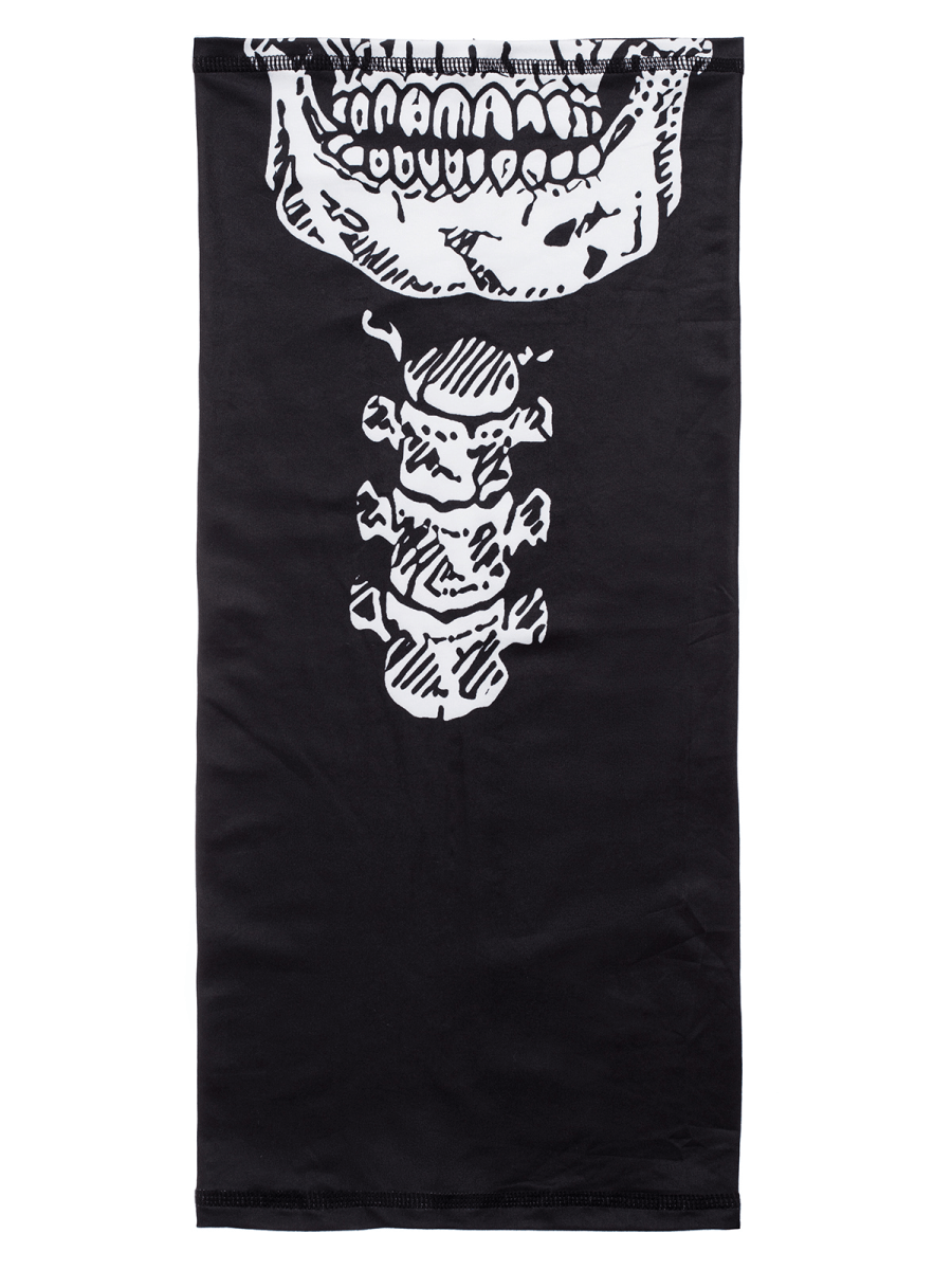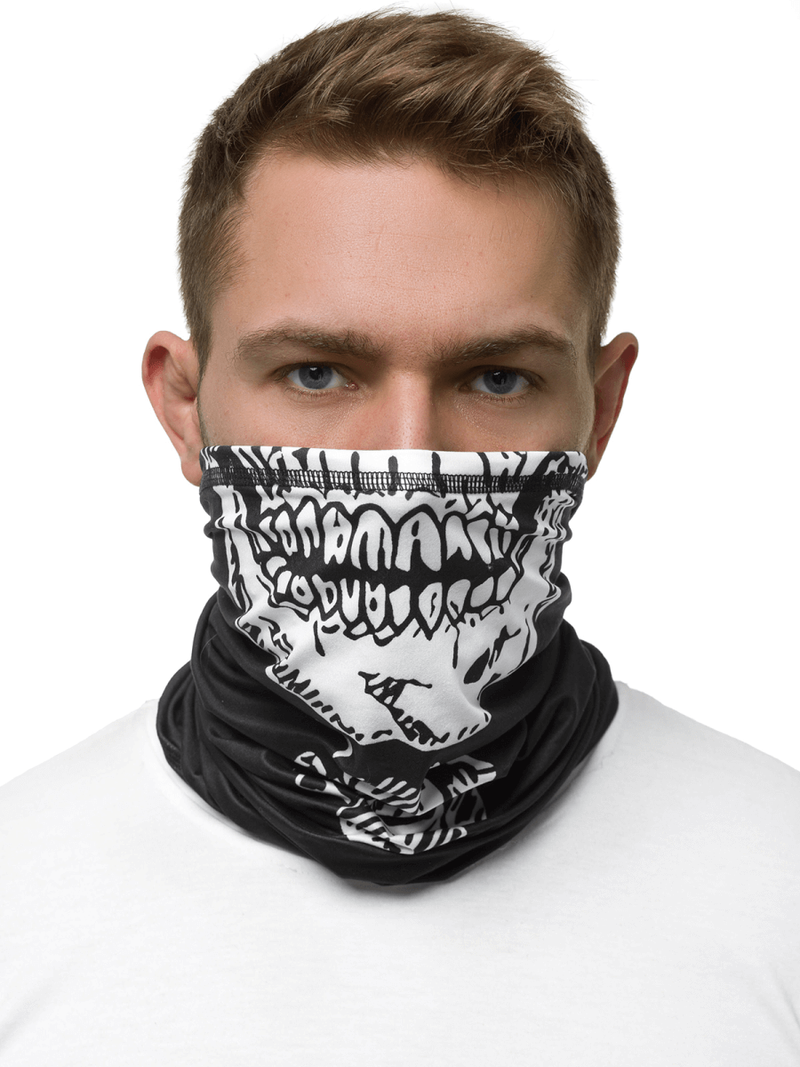 Komin zdobi efektowny, designerski, czarno — biały nadruk z motywem czaszki. Tego typu szalik można nosić na kilka różnych sposobów. Znakomicie sprawdza się on jako pół kominiarka, bandanka, czapka czy chusta na twarz. Komin został wykonany z wysokiej jakości bawełny, poliamidu oraz elastanu. Sprawia to, że jest on wytrzymały, przyjemny w dotyku, miękki i szybko schnie.