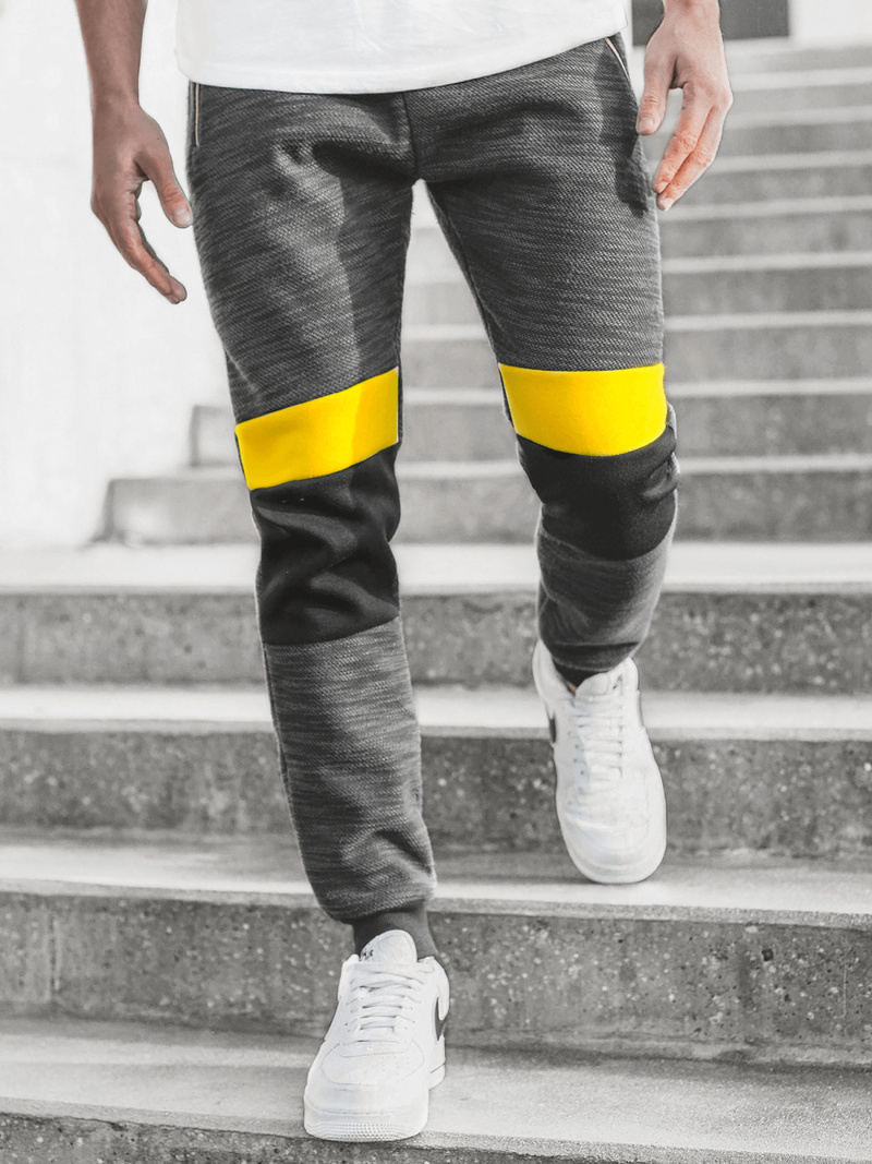 Kontrastowe łączenia tkaniny na nogawkach