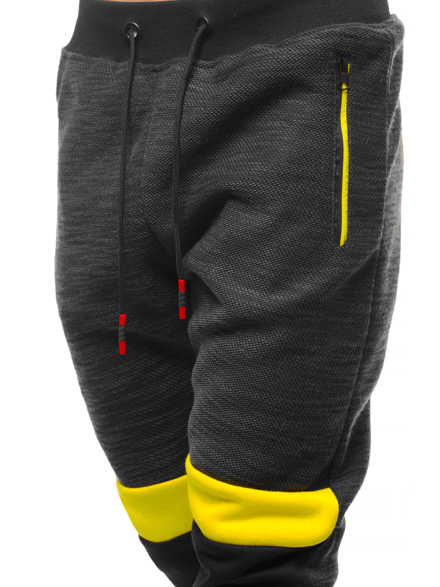 Joggery zostały wykonane z wysokiej jakości bawełny oraz poliestru, dzięki czemu ładnie dopasowują się do sylwetki, są wygodne w noszeniu, przyjemne w dotyku, miękkie, nie rozciągają się i nie gniotą. Ich pas i nogawki są wykończone ściągaczami, które nadają im sportowego charakteru. Joggery mają po bokach kieszenie na zamek błyskawiczny, do których schować można niezbędne drobiazgi. Dzięki kontrastowym łączeniom tkaniny na nogawkach, spodnie prezentują się bardzo oryginalnie.