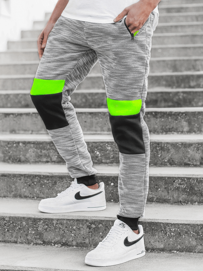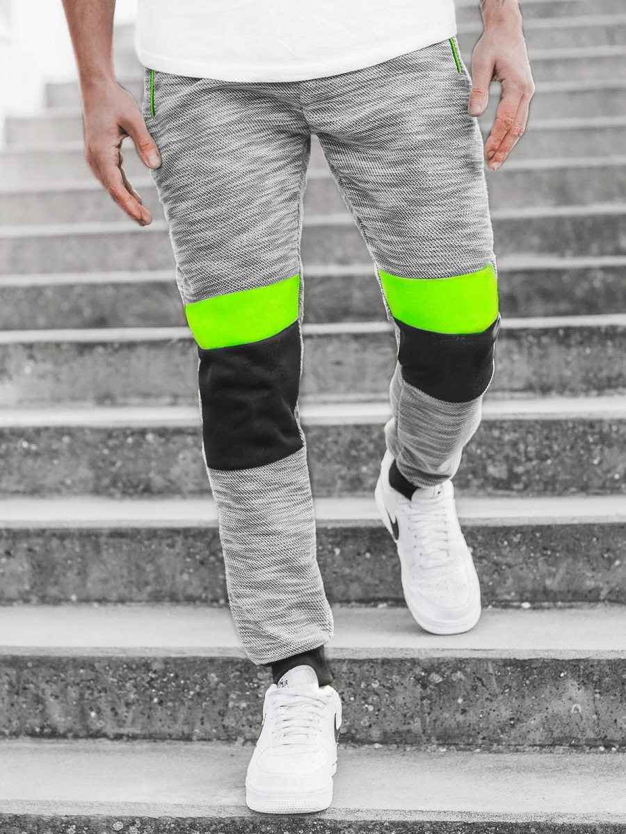 Kontrastowe łączenia tkaniny na nogawkach