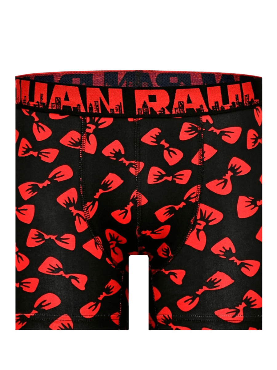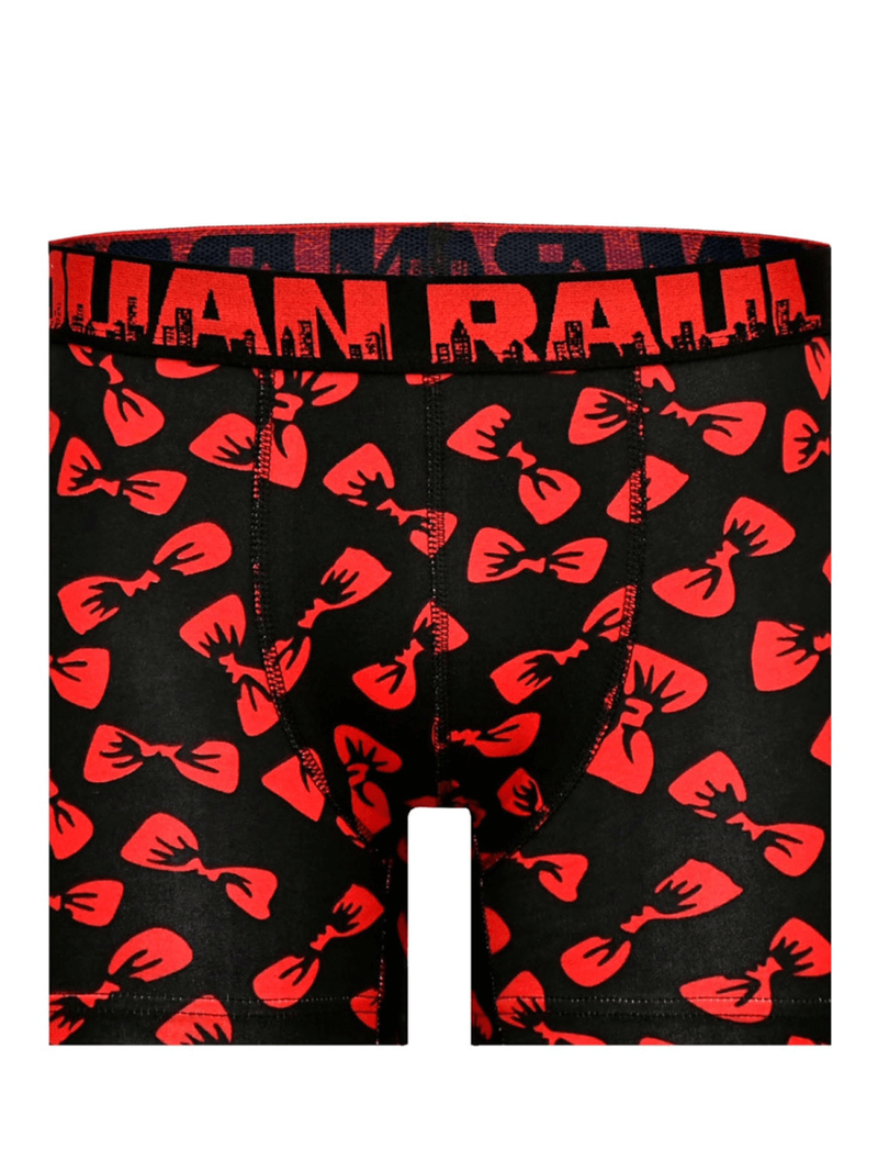 Bokserki są utrzymane w odcieniach czerwieni i czerni. Pokrywa je efektowny nadruk z kokardkami. Bokserki posiadają efektowny ściągacz z napisem, który nie tylko prezentuje się oryginalnie, lecz również chroni bieliznę przed przemieszczaniem się i zsuwaniem podczas noszenia. Model ten został wykonany z wysokiej jakości bawełny z domieszką elastanu. Sprawia to, że jest wygodny w noszeniu, przyjemny w dotyku, ładnie dopasowuje się do sylwetki i nie rozciąga się z czasem.