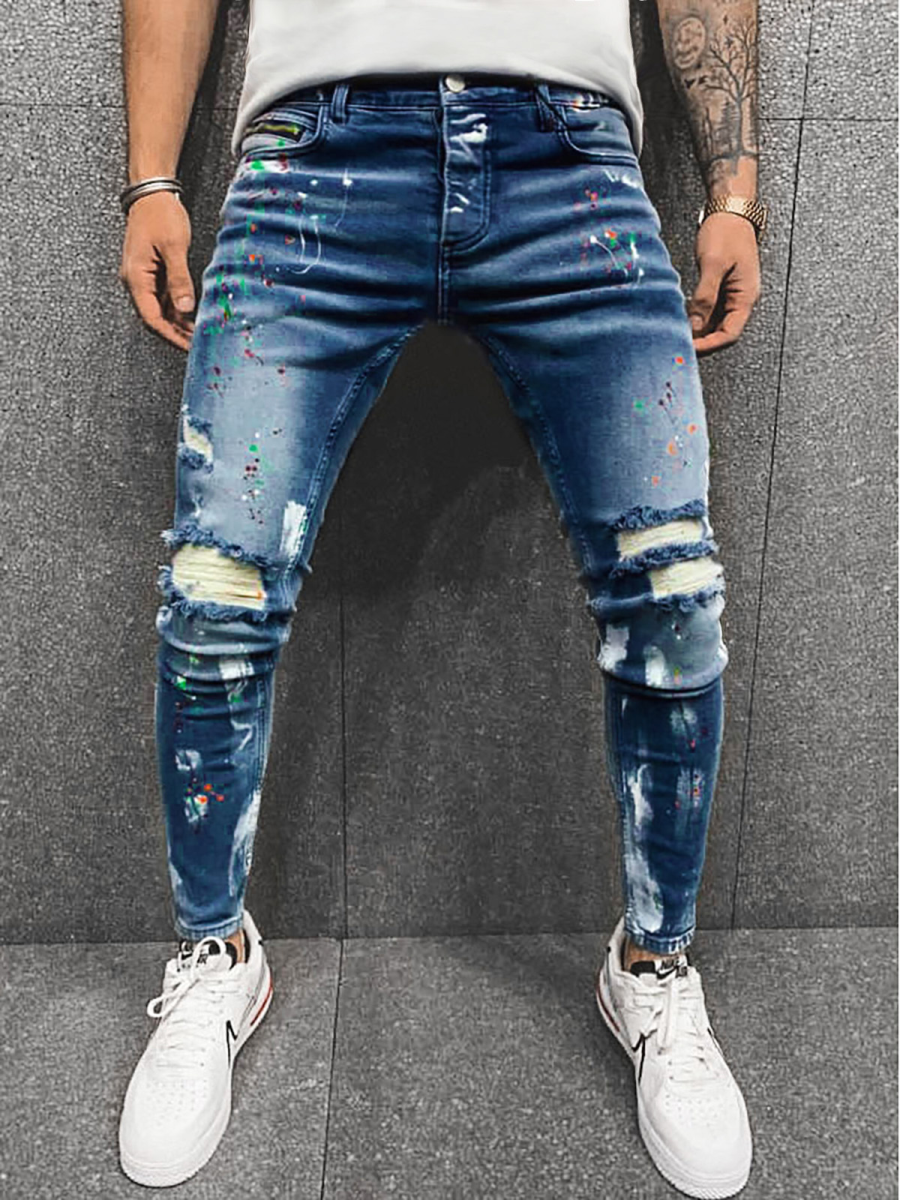 Jeansy męskie z przetarciami i nadrukami