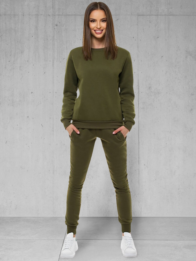 Damski zestaw dresowy w kolorze khaki składa się z 2 elementów. Jednym z nich są spodnie dresowe z kieszeniami po bokach, pasem i nogawkami ze ściągaczami oraz łączeniami tkaniny na nogawkach. W skład kompletu wchodzi również wkładana przez głowę bluza z okrągłym dekoltem typu U-neck i dołem oraz rękawami wykończonymi ściągaczami. Komplet został wykonany z połączenia bawełny i poliestru, dzięki czemu jest wygodny w noszeniu, przyjemny w dotyku i ładnie układa się na ciele.