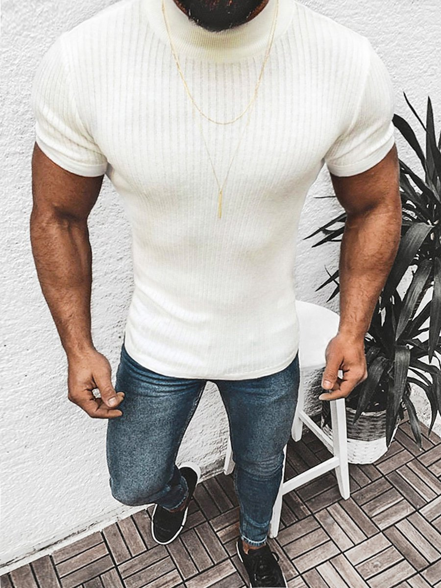Bluzka posiada krótki rękaw, dekolt pod szyję i fakturę w prążki. Została ona wykonana z bawełny z dodatkiem akrylu oraz wiskozy. Sprawia to, że jest bardzo wygodna w noszeniu, przyjemna w dotyku, nie rozciąga się z czasem, nie gniecie i ładnie układa się na ciele.
