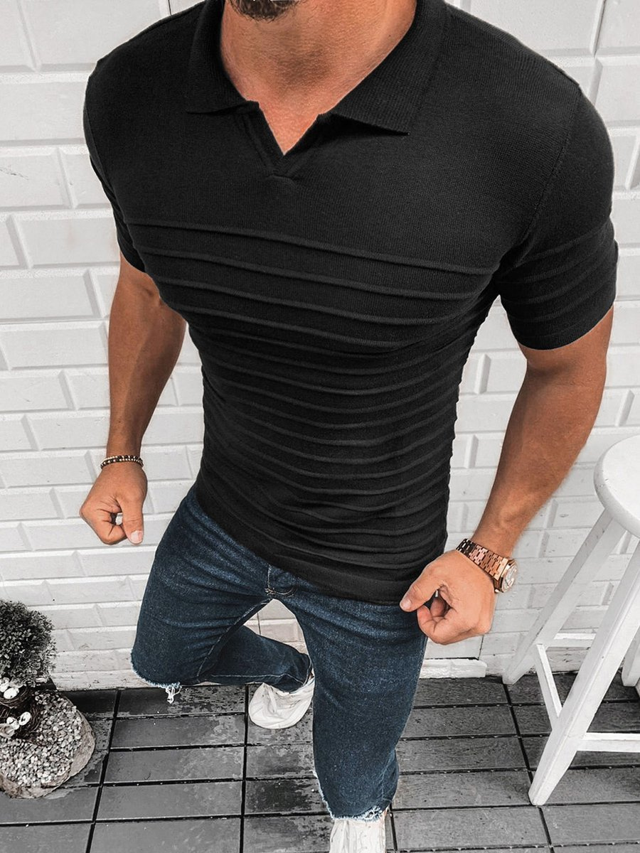 Koszulka ma krótki rękaw i klasyczny kołnierzyk typu kent. Pokrywa ją efektowny, prążkowany wzór. Polówka została wykonana z połączenia bawełny, akrylu oraz wiskozy, dzięki czemu ładnie dopasowuje się do sylwetki, nie rozciąga i nie gniecie, jest wygodna w noszeniu i miła w dotyku.