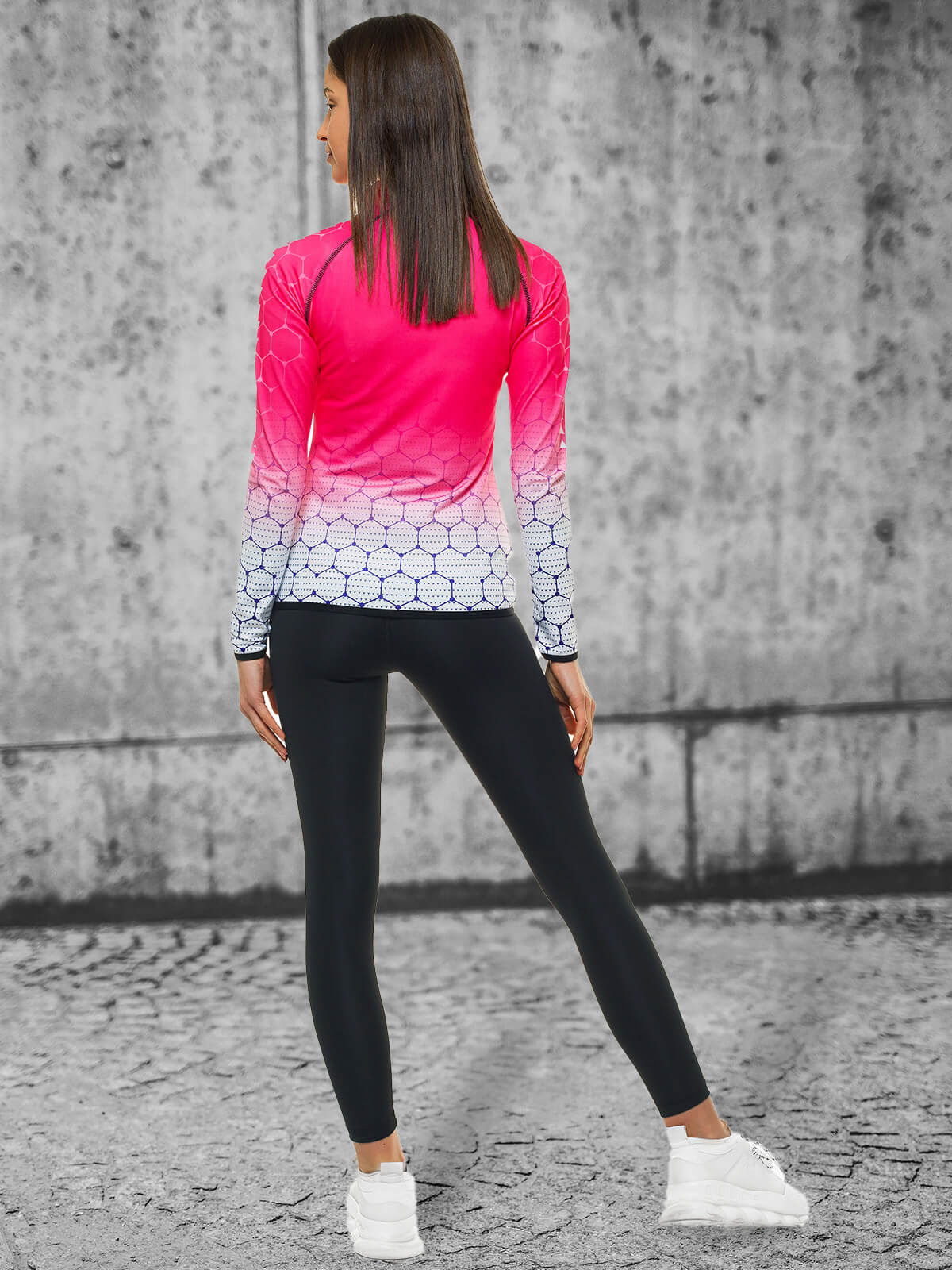 Zestaw dresowy składa się z dwóch elementów. Są nimi legginsy oraz rozpinana bluza z designerskim wzorem i kieszeniami po bokach na zamek błyskawiczny, do których schować można drobiazgi, takie jak telefon czy kluczyk do szatni. Komplet został wykonany z poliestru z domieszką elastanu. Sprawia to, że ładnie dopasowuje się do sylwetki, nie krępuje ruchów, jest wygodny w noszeniu, nie rozciąga się z czasem i nie gniecie.