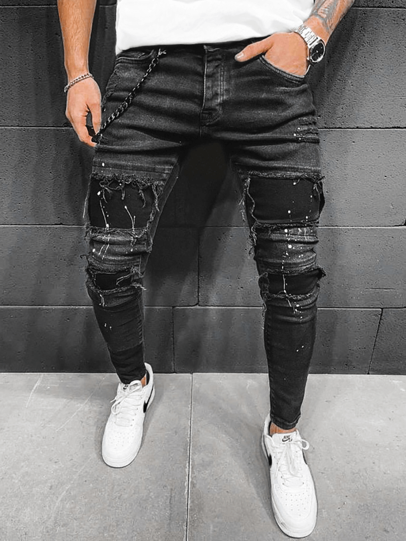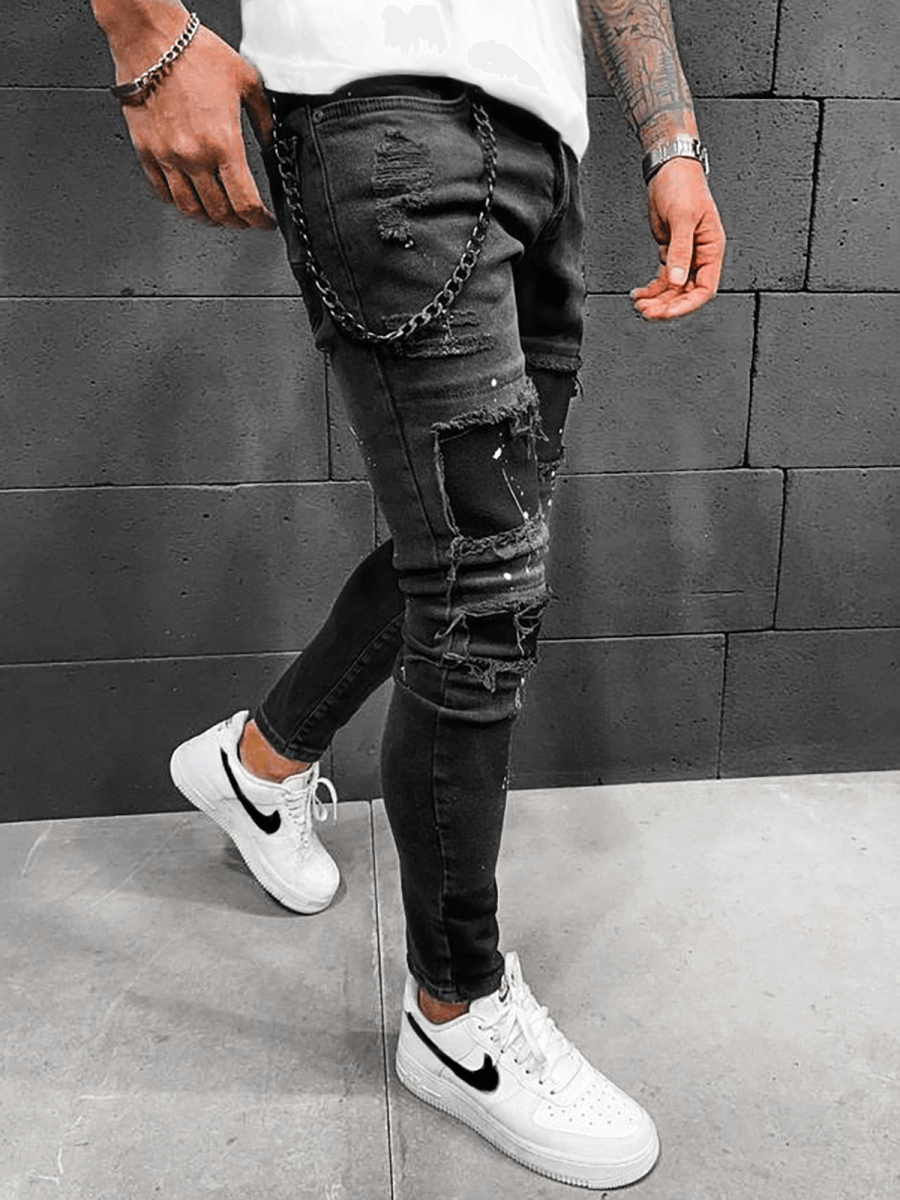 Spodnie przypadną do gustu wszystkim miłośnikom niebanalnej odzieży. Posiadają przetarcia i nadruki na nogawkach oraz ozdobny, odpinany łańcuch z boku. Z przodu oraz z tyłu spodni znajdują się kieszenie. Model ten został wykonany z bawełny z domieszką elastanu, dzięki czemu ładnie dopasowuje się do ciała, jest wygodny w noszeniu i przyjemny w dotyku.