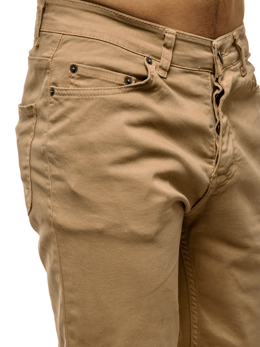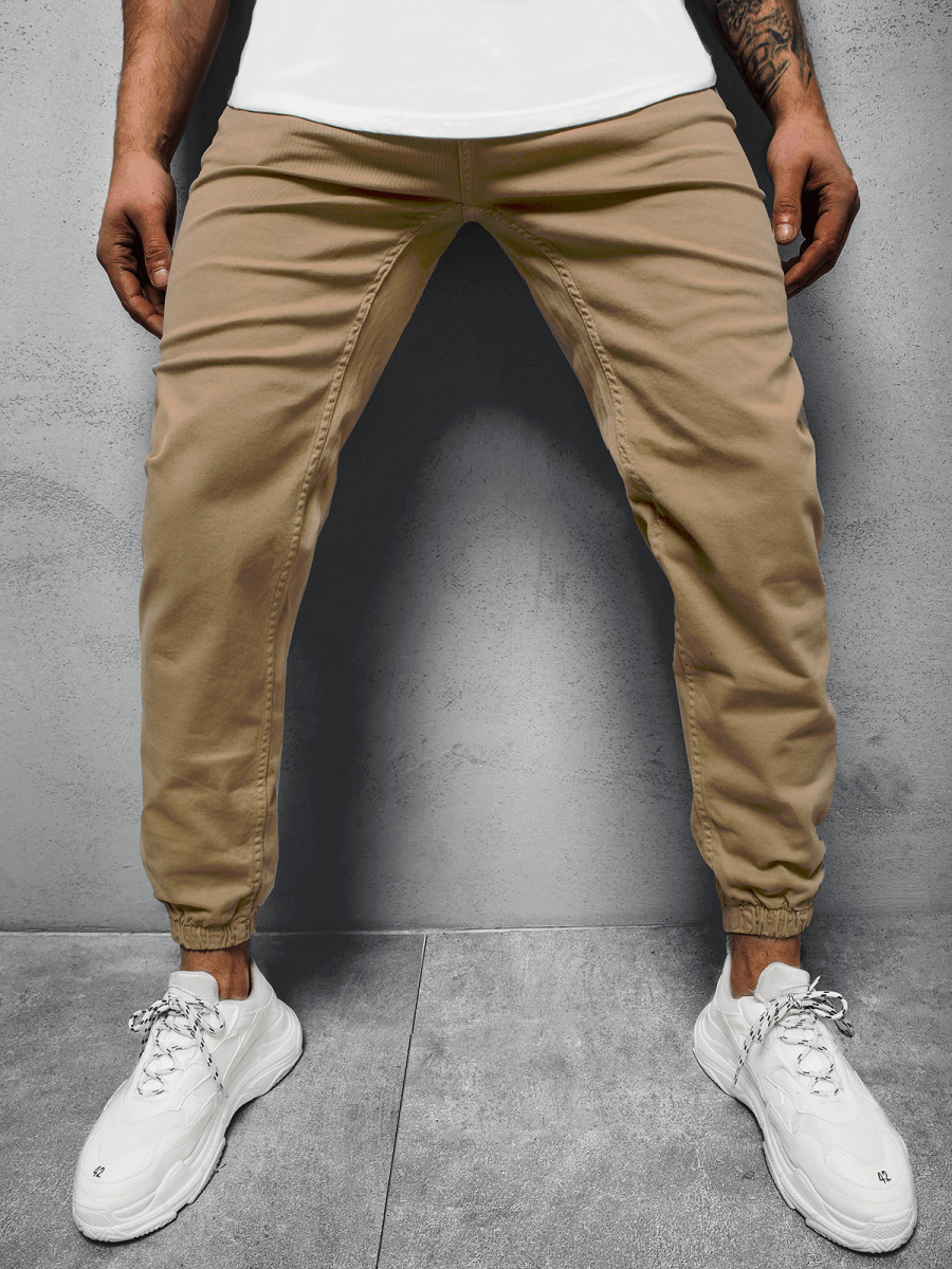 Spodnie mają luźny fason typu joggery. Przy nogawkach znajdują się ściągacze, które nadają im sportowego charakteru. Joggery mają rozporek na guziki oraz kieszenie znajdujące się z przodu i z tyłu. Zostały one wykonane z wysokiej jakości bawełny z domieszką elastanu. Sprawia to, że są wygodne w noszeniu, przyjemne w dotyku, ładnie dopasowują się do sylwetki i nie gniotą się.