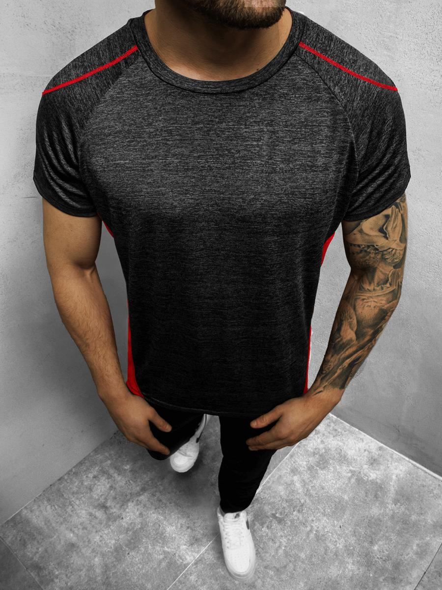 - KOSZULKA POSIADA KONTRASTOWE WSTAWKI PO BOKACH I KONTRASTOWE PRZESZYCIA PRZY RAMIONACH