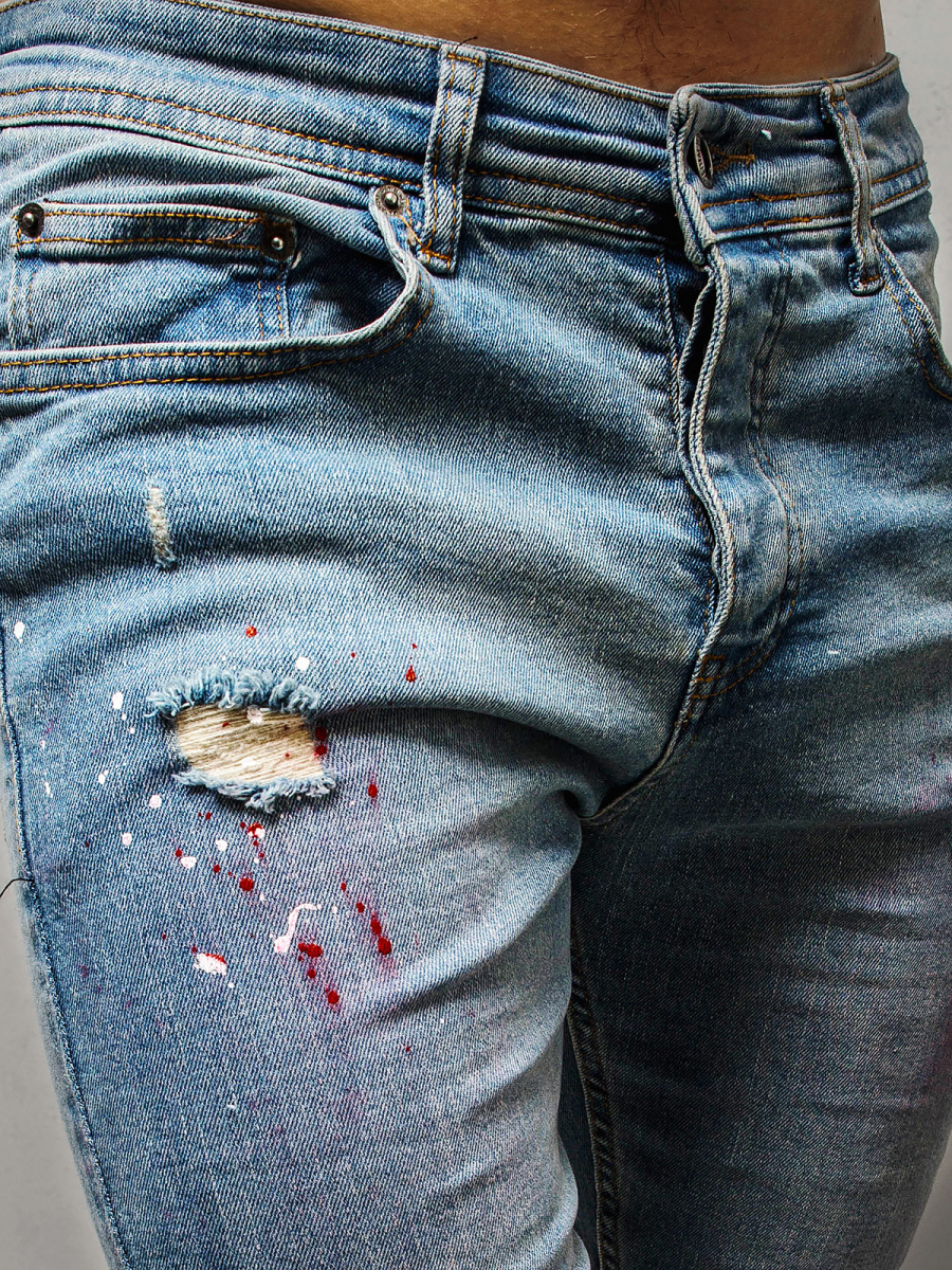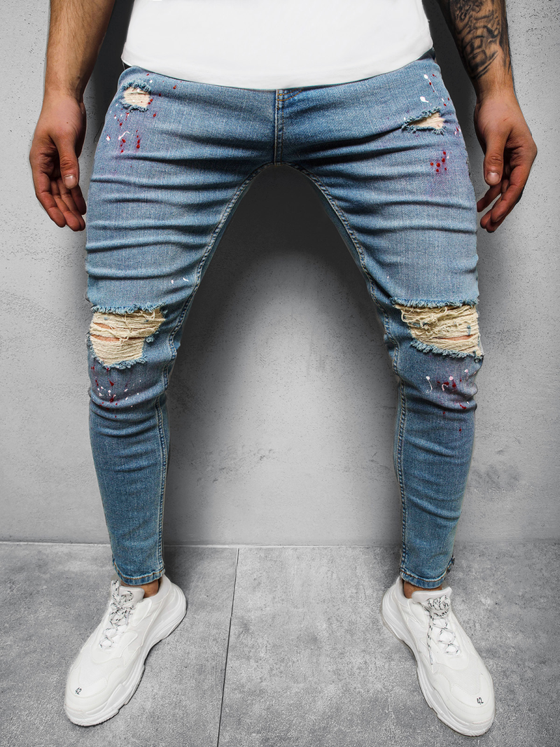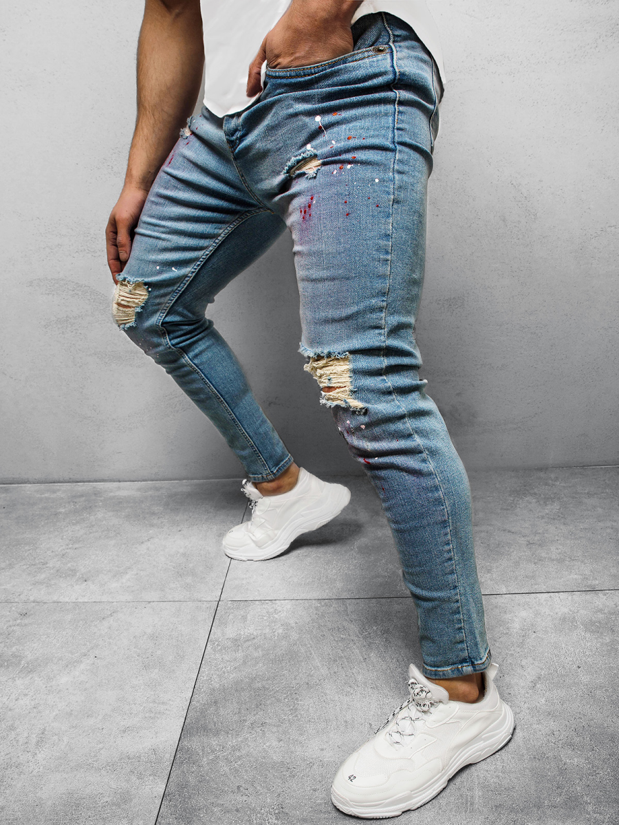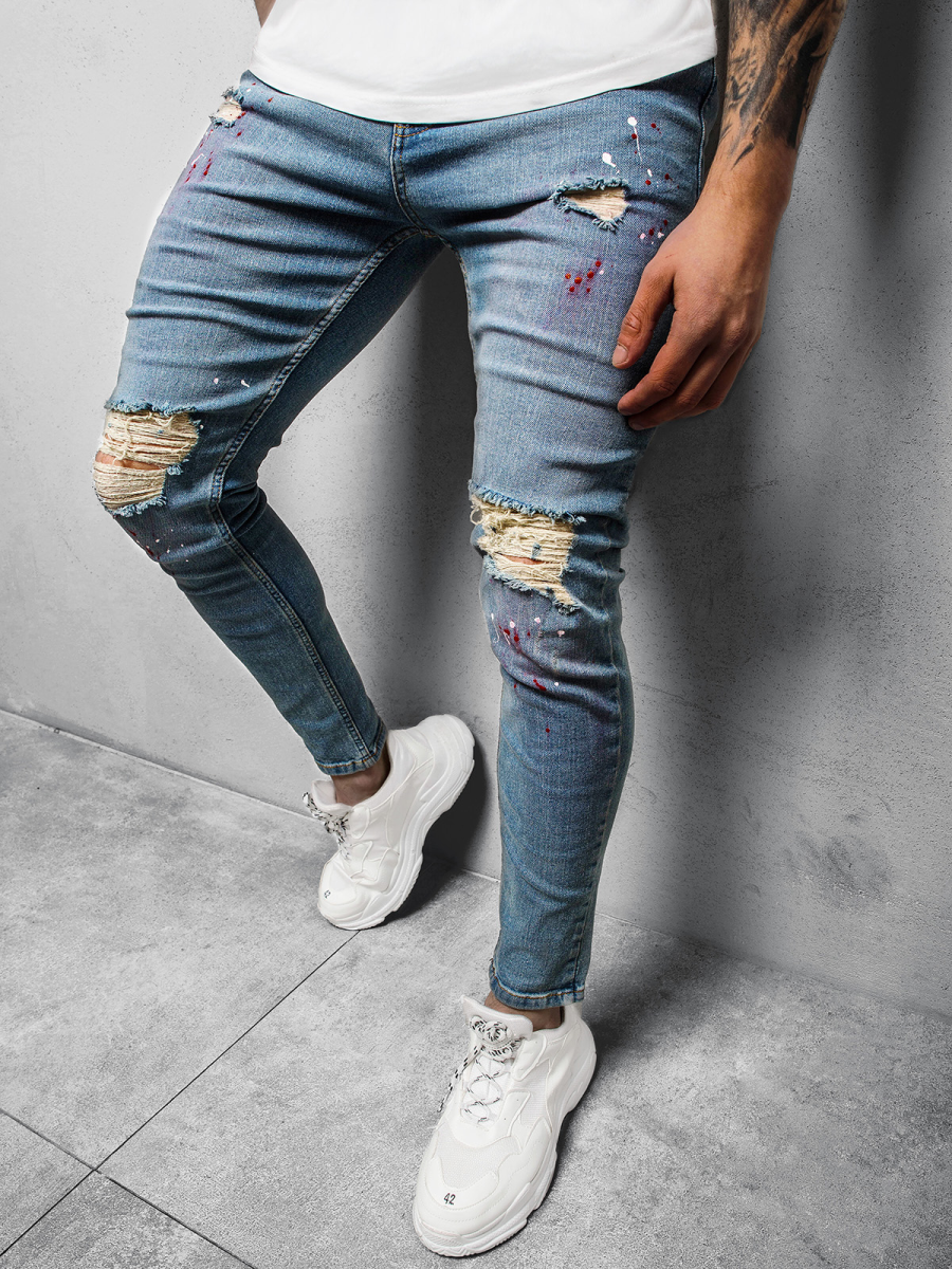 Spodnie mają fason typu rurki, czyli z mocno dopasowanymi nogawkami. Z przodu oraz z tyłu znajdują się kieszenie, do których można schować klucze lub telefon. Nadruki i przetarcia na nogawkach nadają jeansom oryginalnego wyglądu. Model ten został wykonany z bawełny z domieszką elastanu, dzięki czemu ładnie dopasowuje się do sylwetki, jest wygodny w noszeniu, miły w dotyku, nie rozciąga się i nie gniecie.