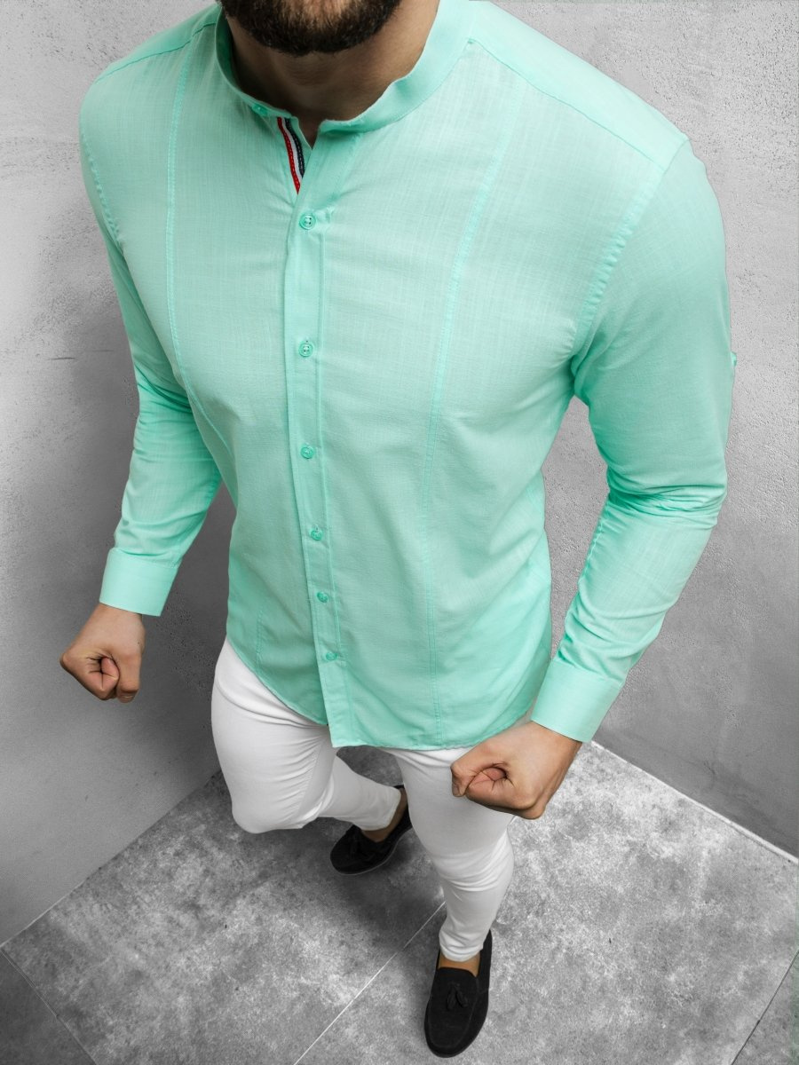 - KOSZULA MĘSKA Z DŁUGIM RĘKAWEM Z NAJNOWSZEJ KOLEKCJI. WYKONANA Z PRZEWIEWNEGO MATERIAŁU. ZAPINANA NA GUZIKI. KOŁNIERZYK TYPU STÓJKA