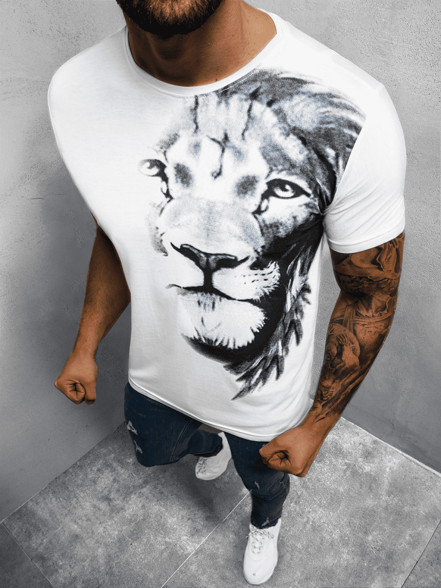T-shirt posiada klasyczny, okrągły dekolt typu U-neck. Zdobi go duży, efektowny, przyciągający nadruk z motywem lwa. Koszulka została wykonana w całości z wysokiej jakości bawełny, dzięki czemu jest przewiewna, przyjemna w dotyku, wygodna w noszeniu i odporna na uszkodzenia oraz zagniecenia.