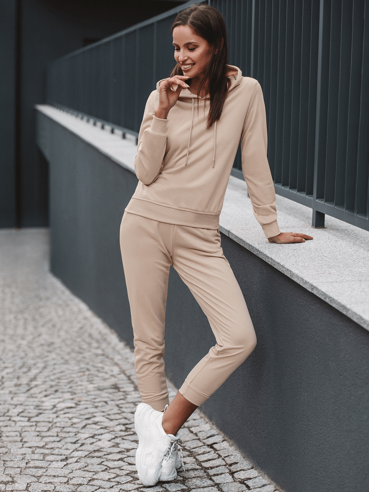 W skład damskiego kompletu dresowego wchodzą 2 elementy. Jednym z nich jest wkładana przez głowę bluza z praktycznym kapturem, który bardzo dobrze sprawdzać będzie się w chłodne, wietrzne dni. Zestaw składa się także ze spodni z kieszeniami po bokach, do których można schować klucze czy telefon. Komplet został wykonany z połączenia bawełny, poliestru oraz elastanu. Sprawia to, że jest wygodny w noszeniu, przyjemny w dotyku i ładnie dopasowuje się do sylwetki.